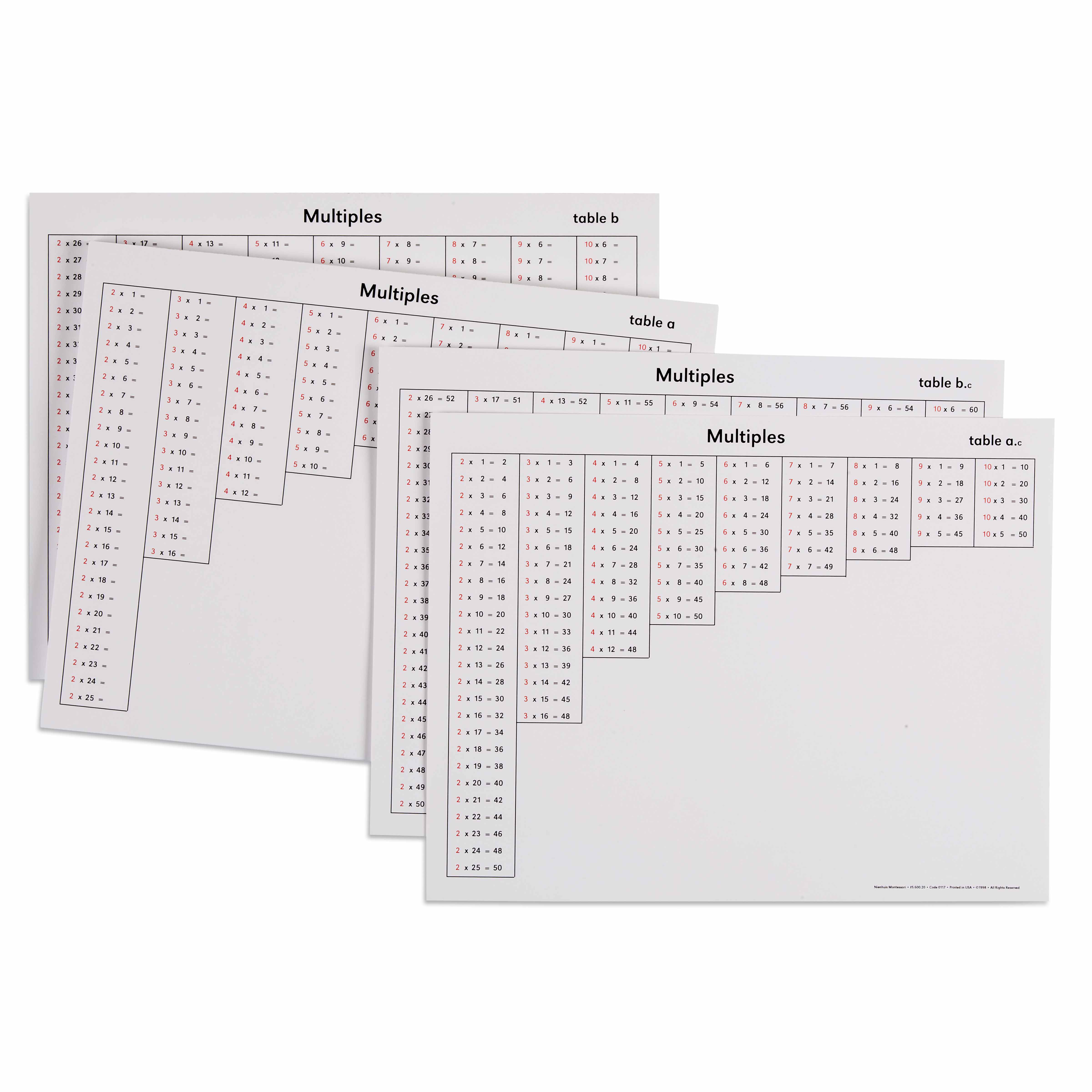 Essential mathematics reference material supporting the Montessori approach to multiplication mastery through visual patterns and relationships. These color-coded multiplication tables provide clear, systematic organization of multiplication facts from basic through advanced levels, enabling independent study and self-correction during the crucial 6-12 mathematical abstraction period.