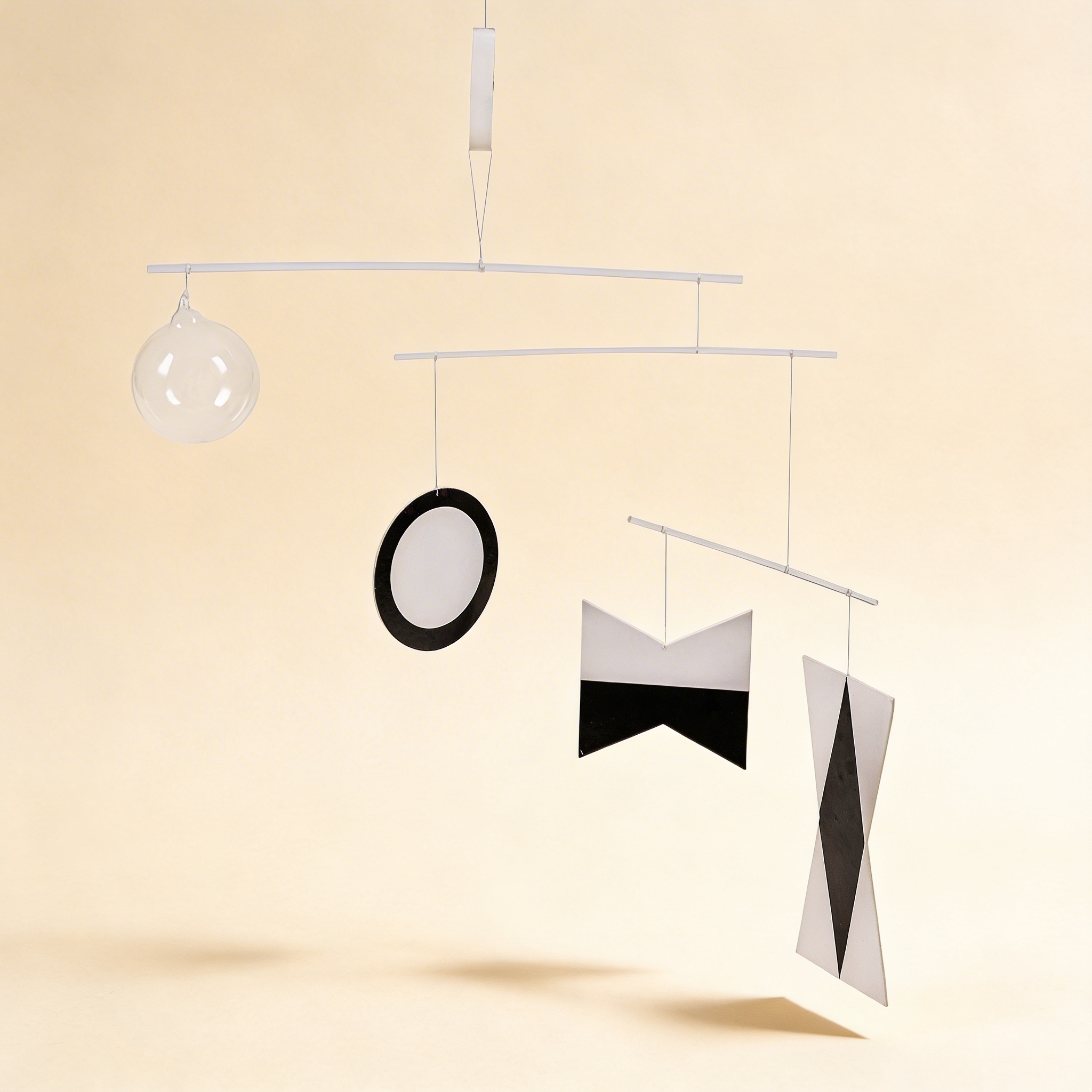 Our Munari Mobile is crafted from high-quality, lightweight materials that ensure perfect balance and gentle movement. The geometric shapes are made from durable paper or lightweight wood in precise black and white contrast, suspended from a carefully balanced wooden frame. The construction meets safety standards for infant use while maintaining the authentic proportions and visual impact that Bruno Munari intended.