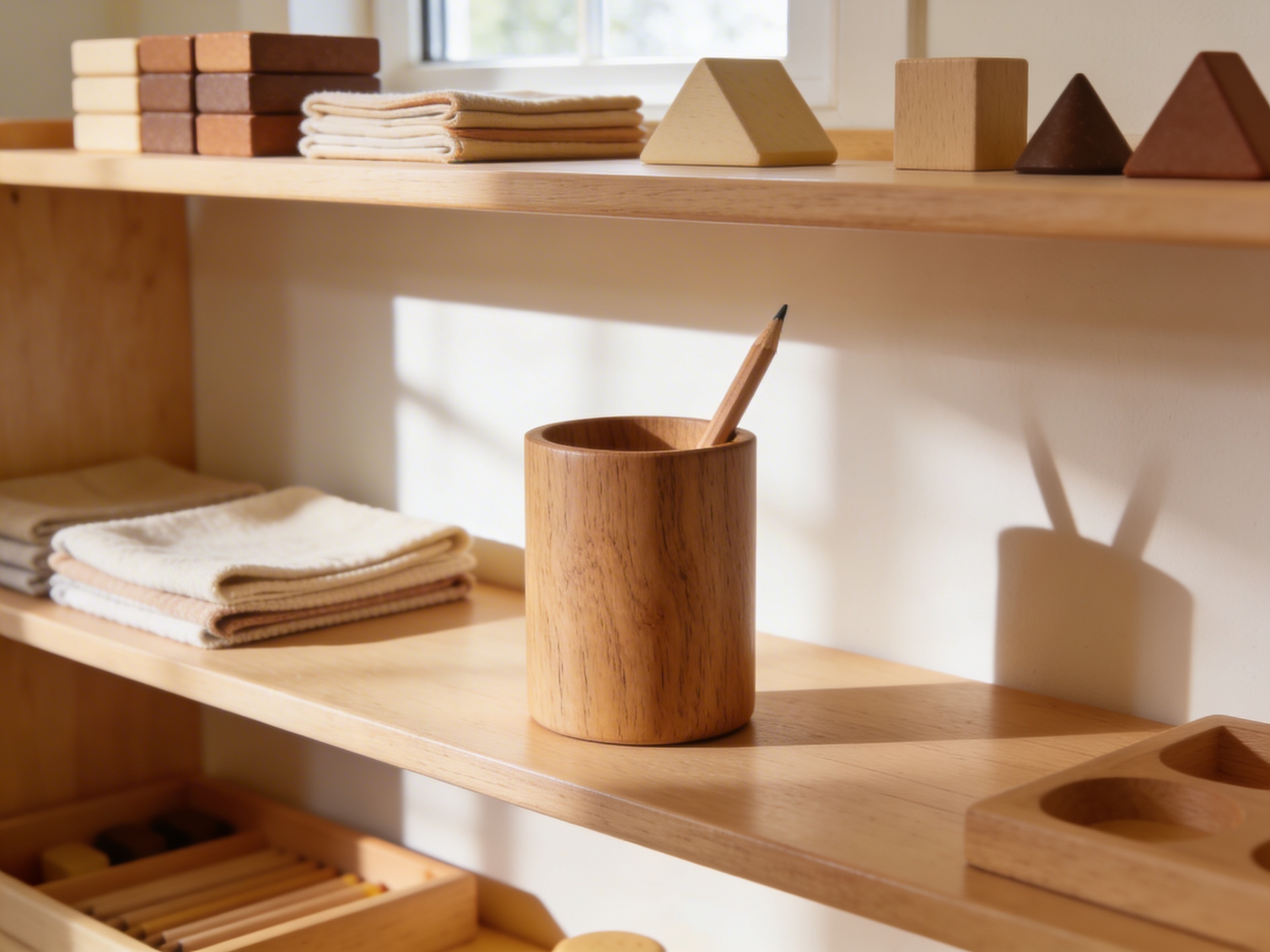The Natural Wood Pencil Holder serves as a fundamental organizational tool in the Montessori classroom, embodying the principle of external order supporting internal order. Its single-piece turned wood construction with wide, stable base prevents tipping, enabling children to retrieve and replace writing tools without frustration. The smooth polished finish of this pencil holder invites touch and careful handling, while its generous cylindrical opening accommodates various writing implements without requiring precise motor control. By providing a designated home for pencils and markers, this natural wood container teaches children that every object has its proper place. The warm wood grain creates an aesthetically pleasing writing area that draws children to engage with mark-making activities. When children independently select and return writing tools to this holder, they practice the complete cycle of activity that builds concentration and responsibility. This simple wooden vessel transforms the act of organizing pencils into a purposeful exercise in care of the environment.