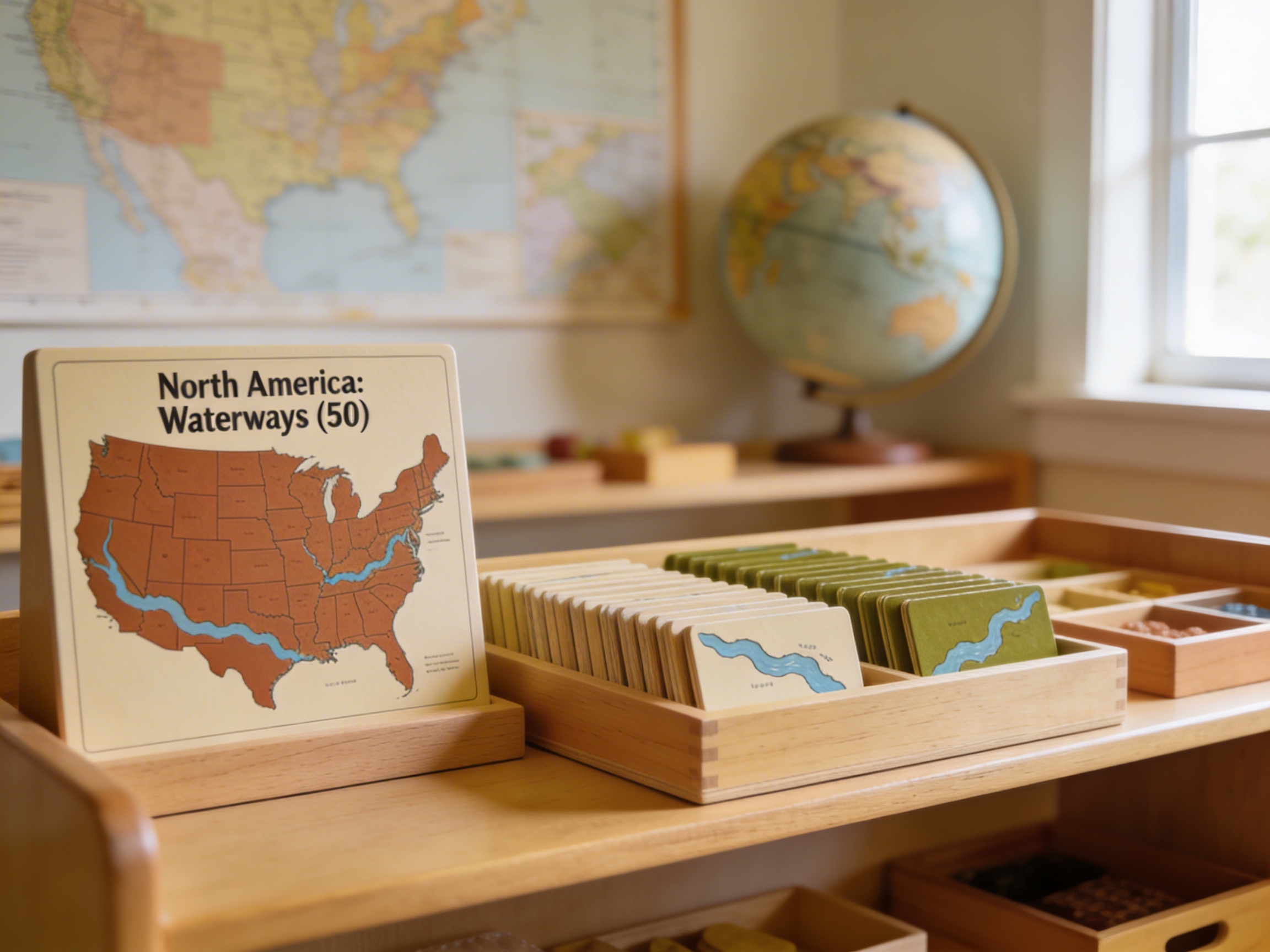 The North America: Waterways map fulfills the young child's need to understand their place within the larger world through concrete, visual representations. This waterways map allows children to trace river systems with their fingers, discovering how water connects distant regions from the Arctic archipelago to the Gulf of Mexico. In Montessori geography, the study of waterways comes after children have grasped land and water forms through sandpaper globes and puzzle maps, as waterways represent more complex geographical relationships. The map's clear boundaries and accurate continental water networks satisfy the child's desire for order while presenting real geographical knowledge. By exploring North America's interconnected water systems, children develop an understanding of how rivers, lakes, and oceans shape human civilization and natural environments. This material bridges the sensorial exploration of water through pouring exercises with the abstract concept of continental water systems, making geography tangible and meaningful.