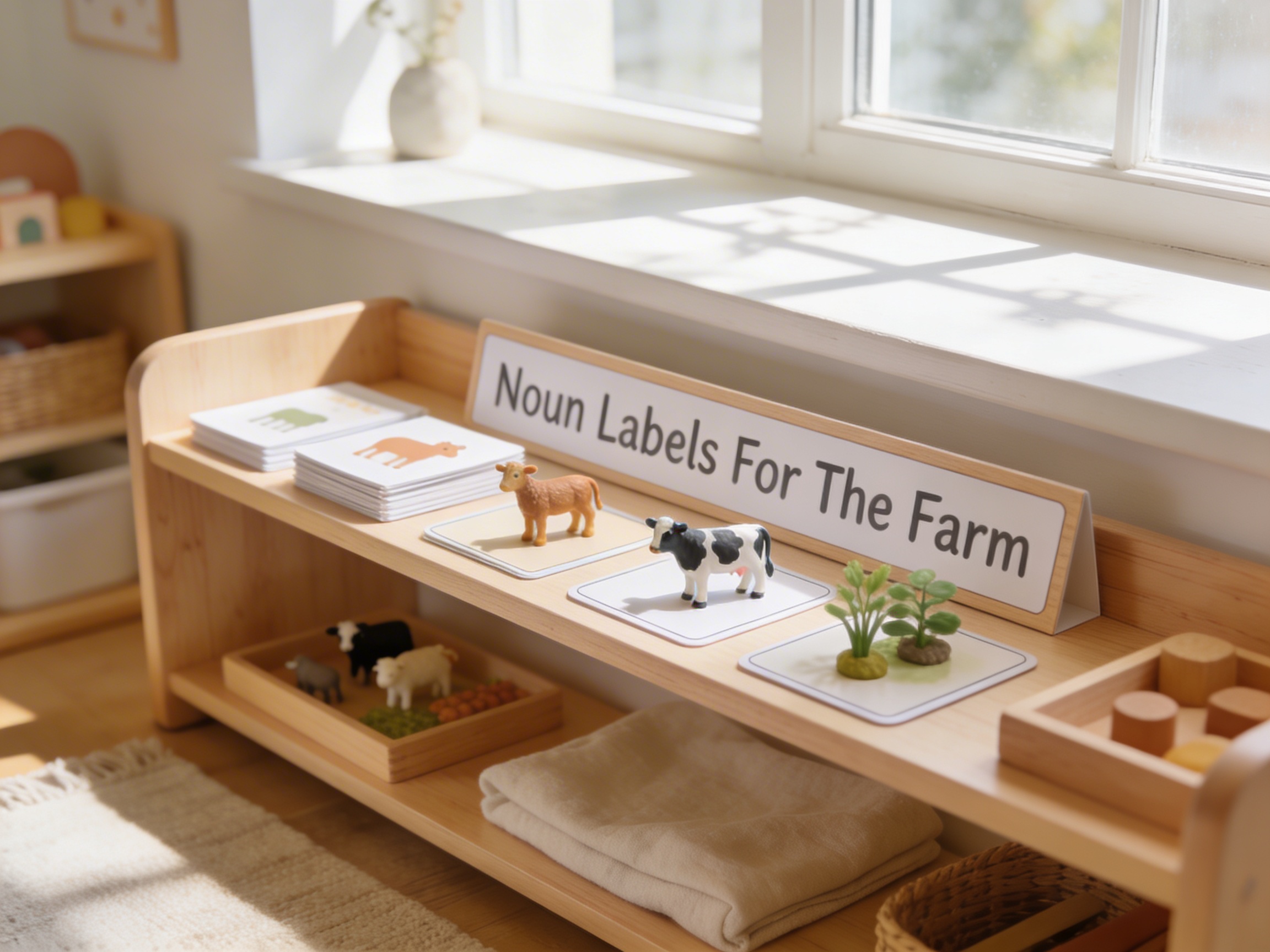 The Noun Labels For The Farm address the child's sensitive period for language through concrete vocabulary building. These printed cardstock labels transform abstract written words into meaningful connections with familiar farm concepts. The farm theme capitalizes on children's natural fascination with animals and rural life, making first reading experiences engaging and accessible. Each label's clear, readable text on durable cardstock provides consistent visual input essential for early literacy. The acrylic storage container ensures these vocabulary tools remain organized and accessible for independent work. By offering farm-specific vocabulary in isolation, these labels allow children to focus purely on word recognition without illustration distractions. The noun labels bridge spoken language to written symbols through farm contexts children understand intuitively. This material recognizes that meaningful vocabulary acquisition happens when children connect written words to concepts they find personally interesting.
