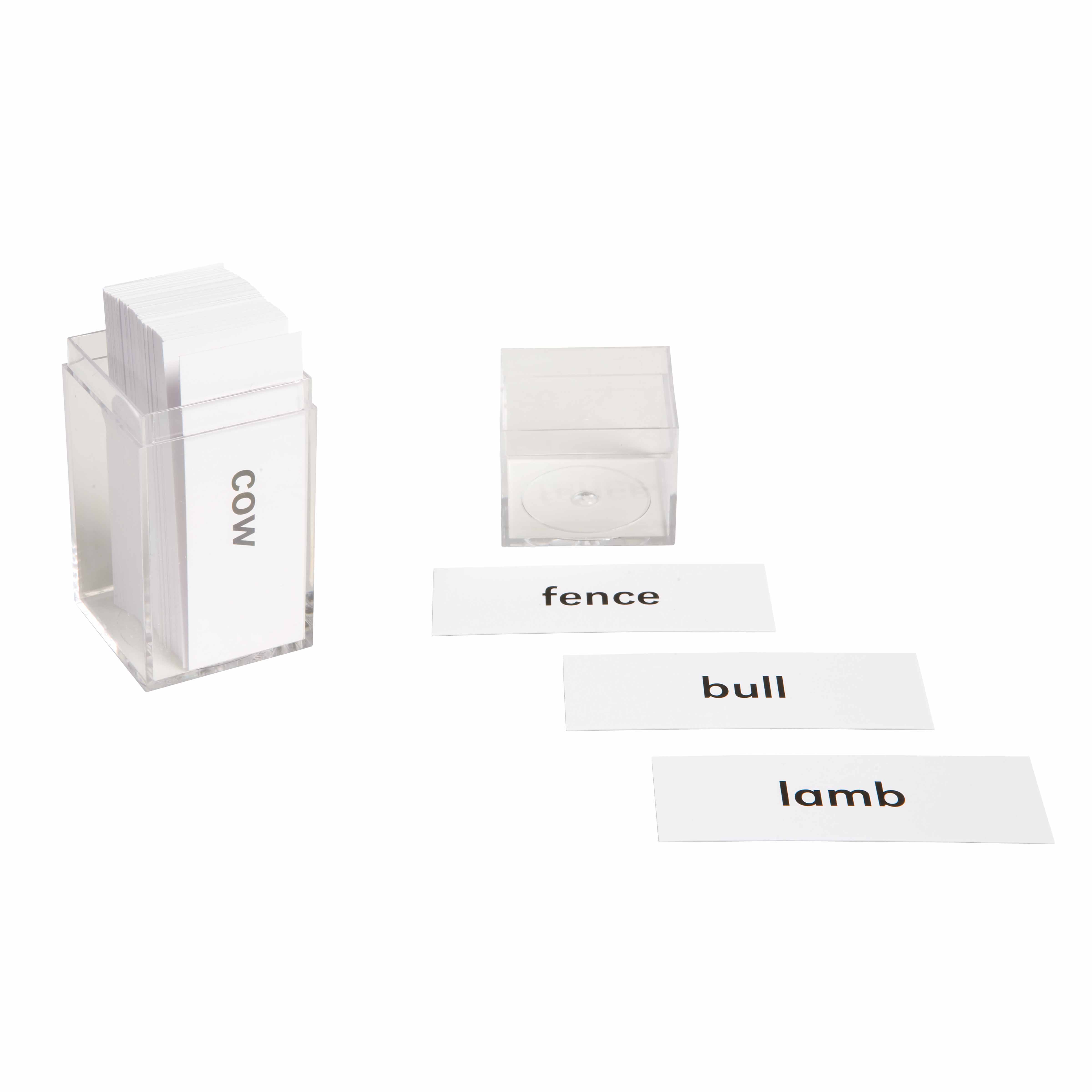 This comprehensive set of noun labels brings farm vocabulary to life in the Montessori language curriculum. The printed cardstock labels feature clear, readable text for common farm animals and objects, stored in a durable acrylic container for easy organization. Designed to support reading readiness and vocabulary expansion, these labels integrate seamlessly with farm-themed materials and activities in the prepared environment.