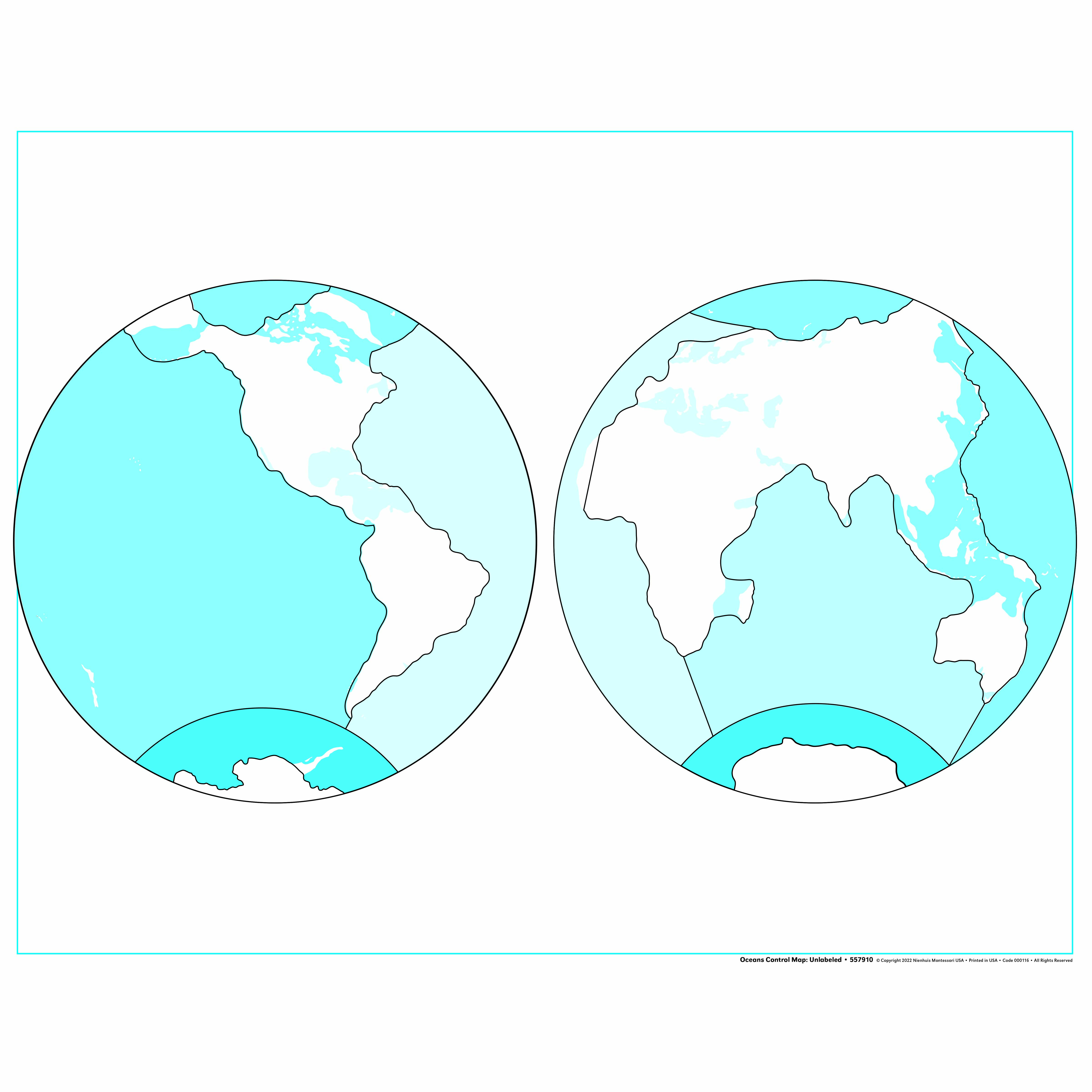 The Oceans Control Map serves as a reference guide in Montessori geography work, providing children with a visual standard against which to verify their own work with puzzle maps and pin maps. This unlabeled control map specifically addresses the young child's need to understand Earth as a whole before diving into detailed study of individual continents. The turquoise oceans and white landmasses create a clear visual distinction that helps children aged 3-6 grasp the fundamental concept that Earth is covered primarily by water. In Montessori classrooms, control maps function as self-correcting tools, allowing children to check their work independently without adult intervention. The two-hemisphere projection on this Oceans Control Map mirrors the layout of corresponding Montessori puzzle maps, creating consistency in the child's geographic explorations. By presenting oceans without labels, this map encourages children to focus first on shape recognition and spatial relationships before adding the complexity of reading. The control map format respects the child's natural progression from concrete to abstract understanding, supporting their journey toward geographic literacy.
