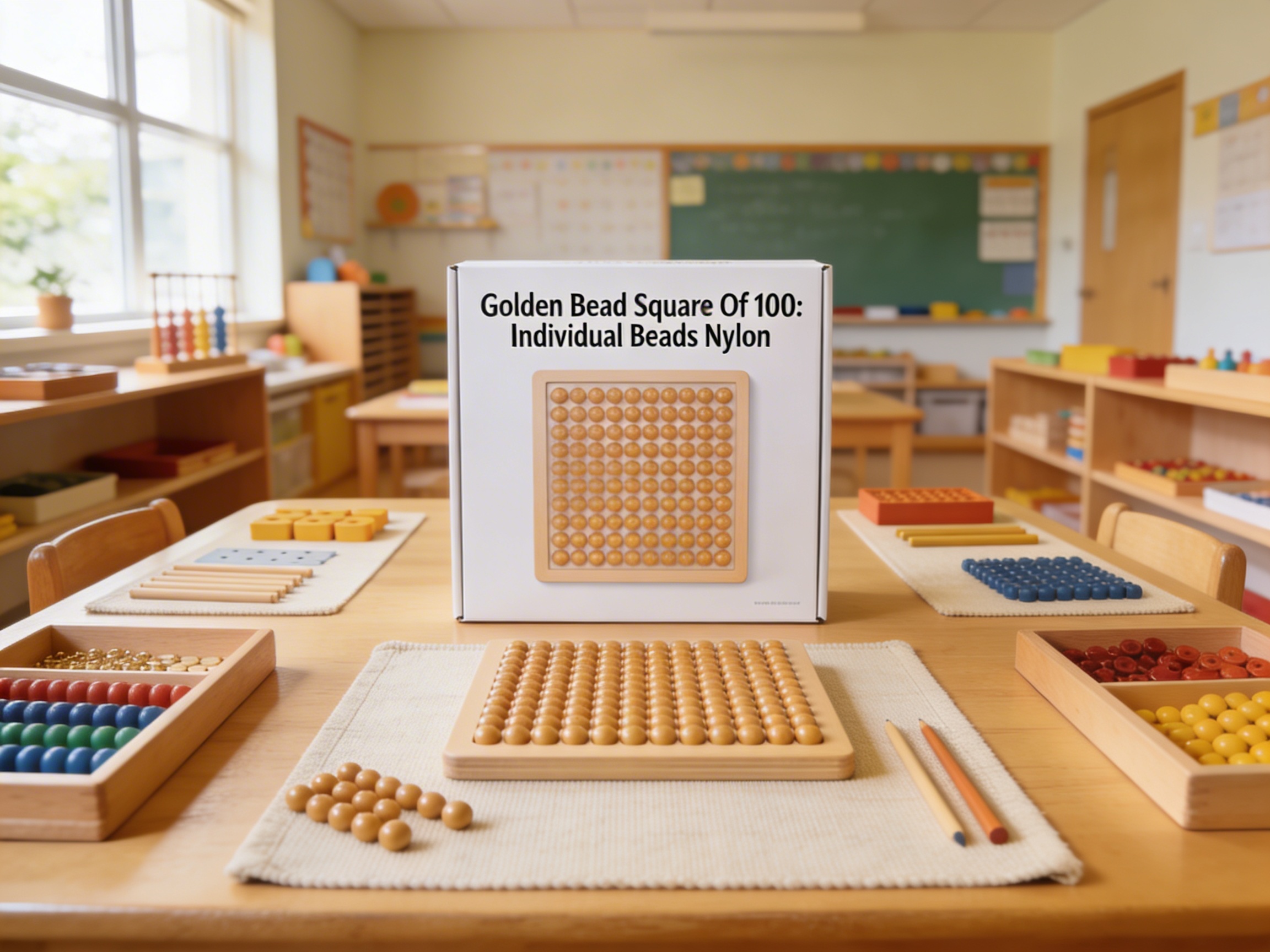 The One Golden Bead Square of 100 embodies Maria Montessori's insight that children learn mathematical abstractions through repeated sensorial experiences with concrete materials. Each golden bead in this 10x10 grid represents a tangible unit, while the square's complete form reveals how one hundred emerges from ten groups of ten. The nylon cord construction creates a flexible square that children can manipulate, fold, and examine from multiple angles, deepening their understanding of quantity through movement. When children hold this golden bead square, they physically experience the weight and volume of one hundred, creating muscle memory that later supports mental computation. The wire loops enable precise handling as children exchange ten separate ten-bars for this single square, discovering the efficiency of grouping in our decimal system. This golden bead square serves as a bridge between counting individual beads and grasping the concept of the hundred as a complete entity, preparing the mathematical mind for place value understanding.