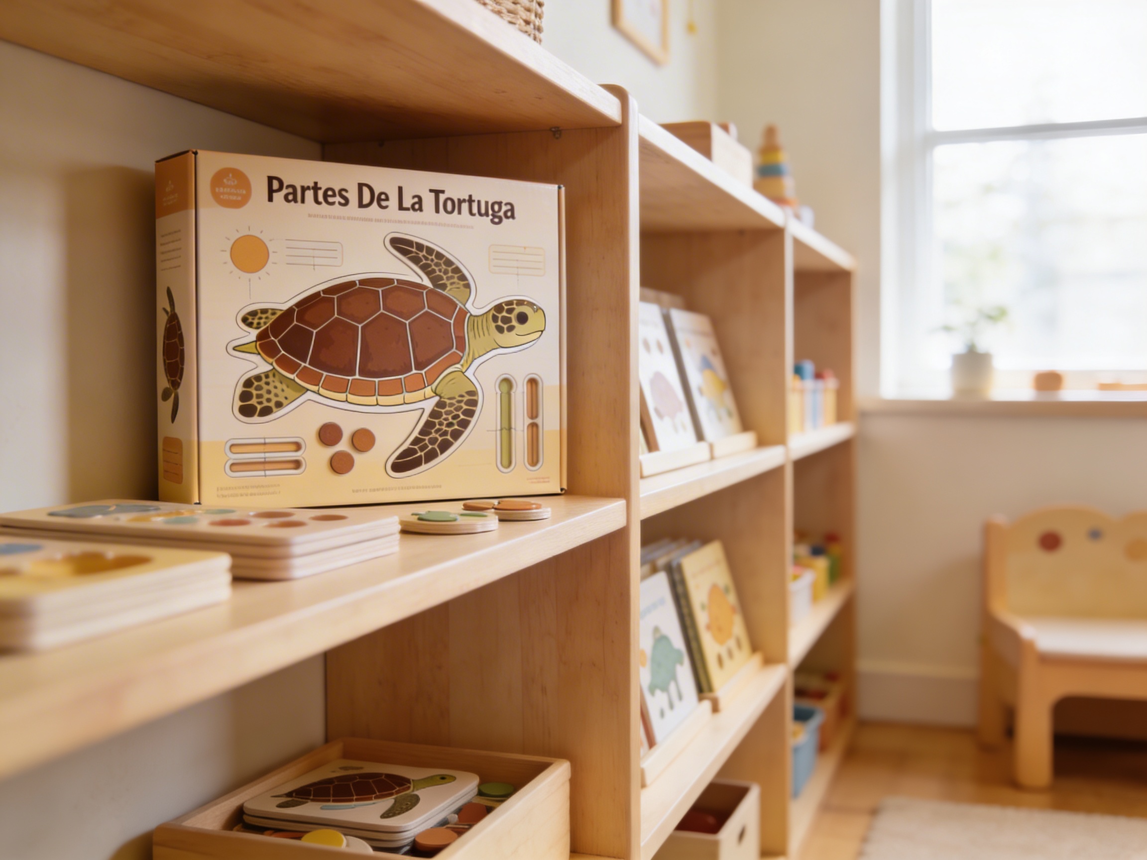 The Partes De La Tortuga nomenclature cards exemplify Maria Montessori's principle of isolating difficulty by presenting zoological concepts through structured language work. These three-part cards featuring turtle anatomy in Spanish address the child's sensitive period for both language acquisition and classification during the 3-6 years. The colored control cards provide visual memory support while grayscale illustrations require careful observation to match correctly. Separating Spanish vocabulary labels from images allows children to build reading skills independently from picture recognition. This systematic approach to introducing scientific terminology through matching work respects the child's need for order while building precise vocabulary. The cards' focus on turtle body parts satisfies children's intense interest in living creatures during this developmental stage. By working with Spanish nomenclature specifically, children absorb a second language naturally through concrete, meaningful content rather than abstract translation exercises.