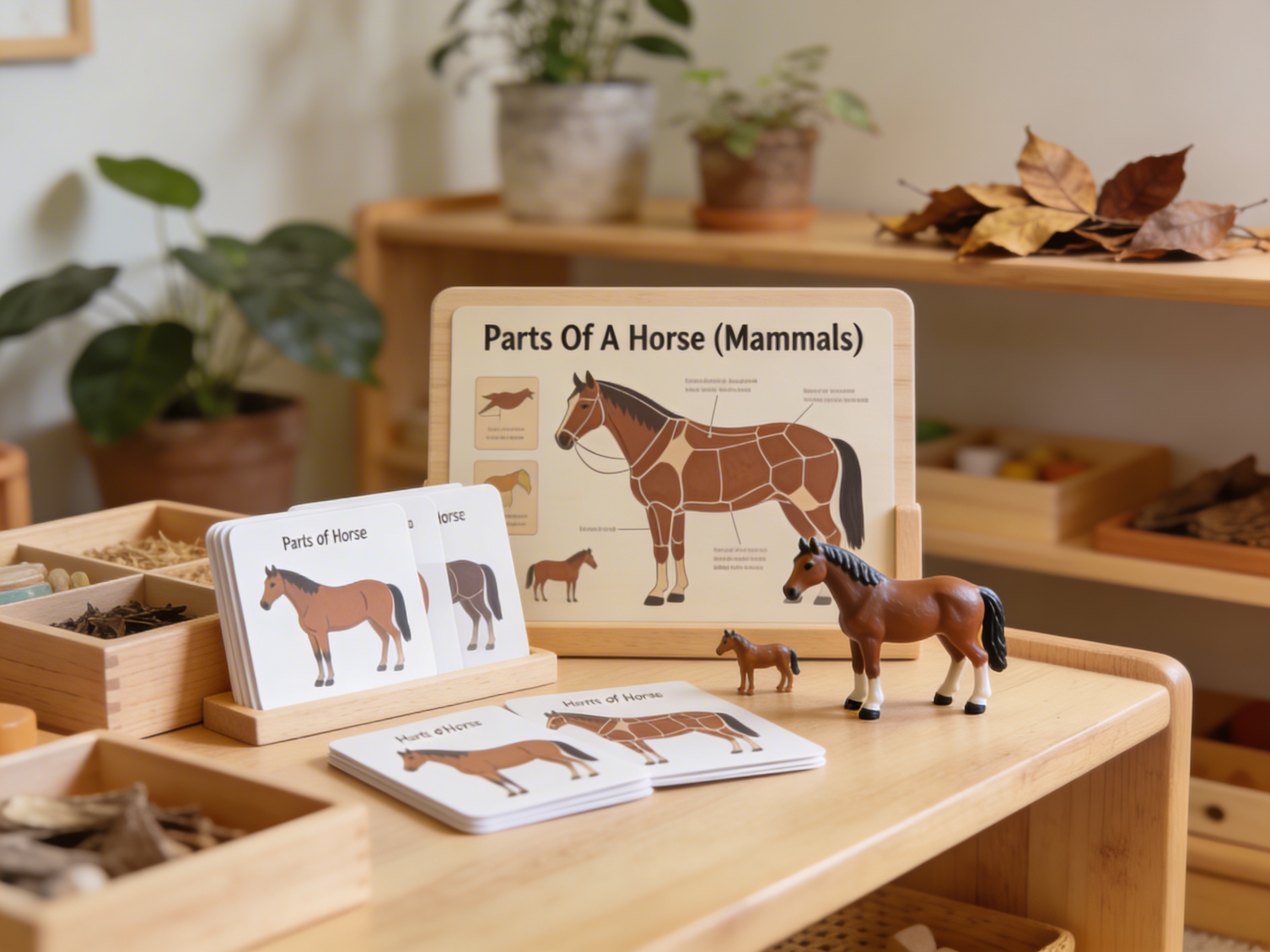 The Parts of a Horse nomenclature cards fulfill the young child's deep need to know the names of everything in their world. These three-part cards specifically address the 3-6 year old's sensitive period for language by presenting isolated horse anatomy through clear, precise images. Each card isolates one body part—mane, hoof, tail, muzzle—allowing focused attention on distinct features. The horse, as a familiar mammal, provides an accessible entry point for understanding animal classification. By matching picture cards to corresponding labels, children satisfy their drive for order while building the precise vocabulary needed for future zoology work. The Parts of a Horse cards transform abstract anatomical concepts into concrete, manipulable materials that children can arrange, classify, and master through repetition. This systematic approach to learning mammalian anatomy through the horse's body parts establishes foundational patterns for scientific thinking and observation skills.