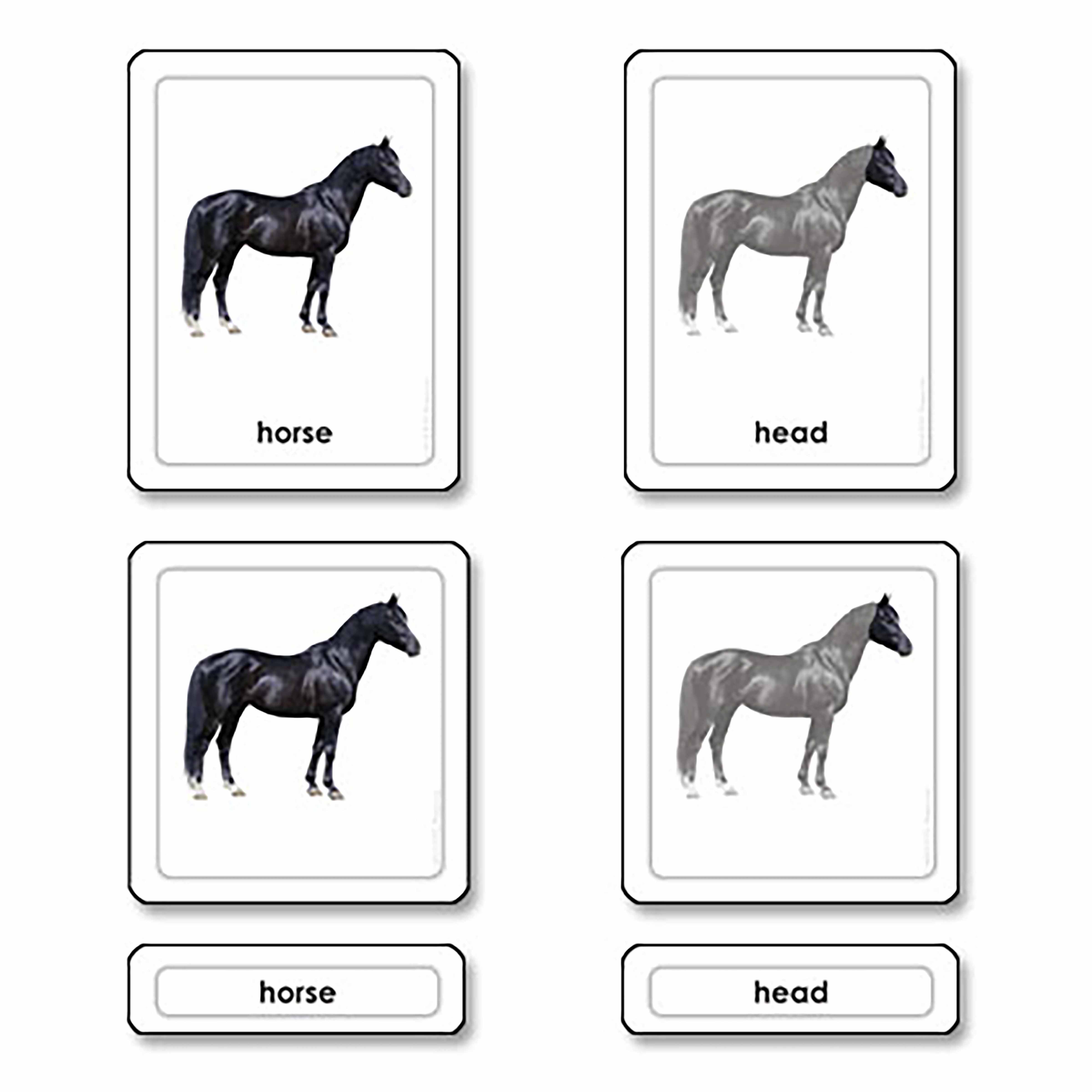 These Parts of a Horse nomenclature cards introduce children to mammalian anatomy through precise, isolated images of the horse's body parts. The three-part card format follows Montessori language principles, allowing children to match pictures with labels while building vocabulary and classification skills essential for zoology studies.