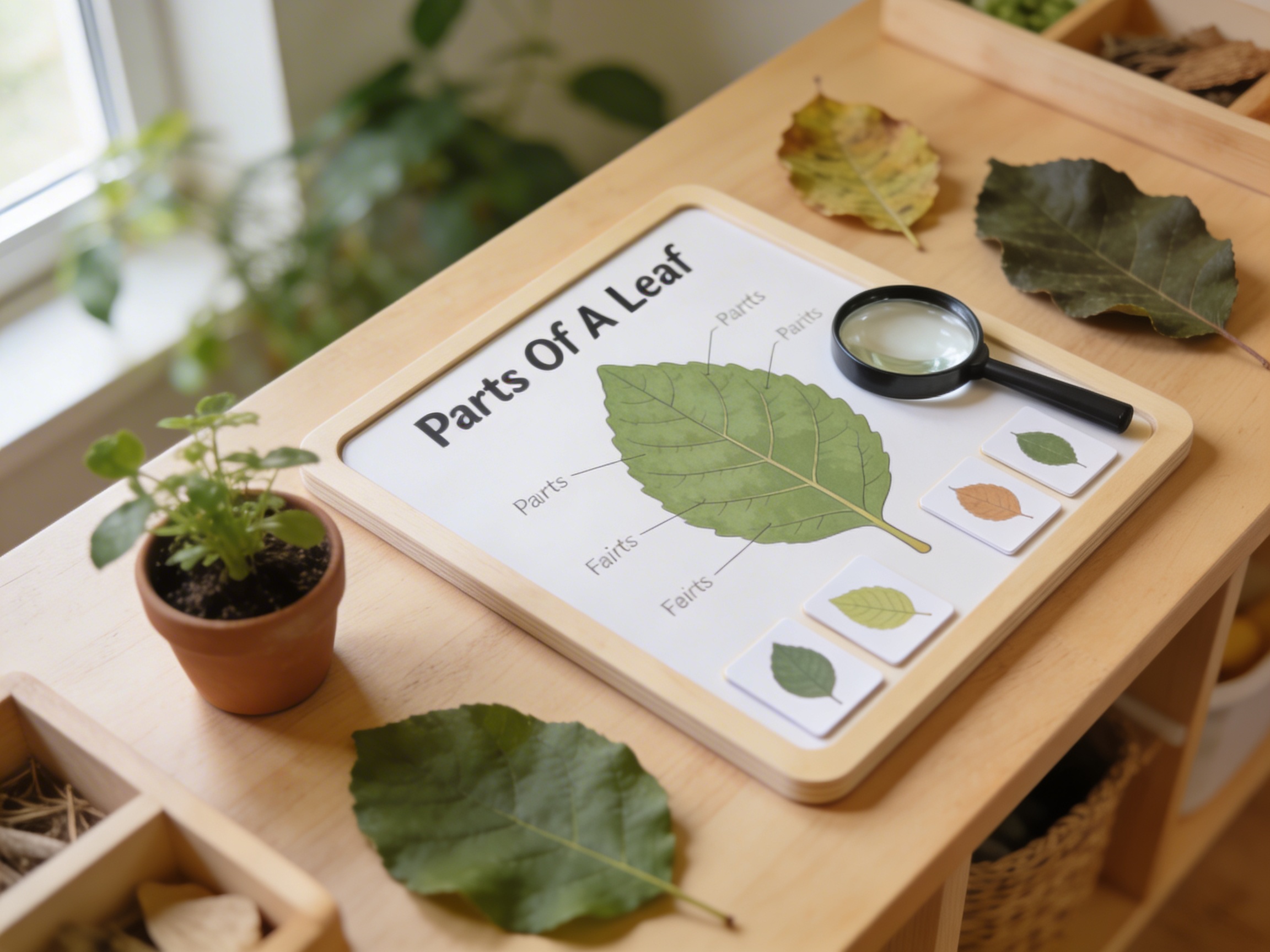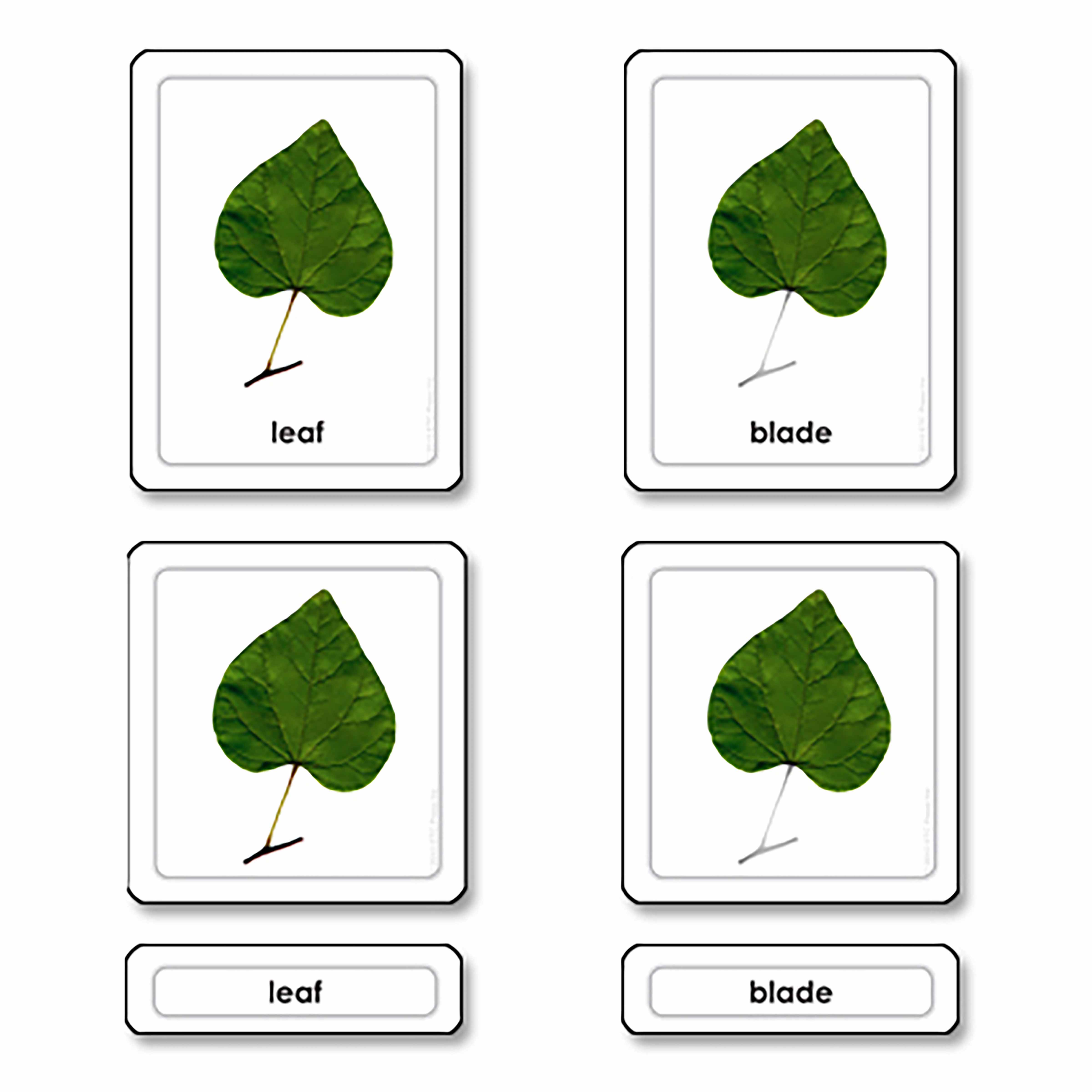 The Parts of a Leaf three-part cards serve as the young child's first formal introduction to botanical classification in the Montessori classroom. These laminated cardstock materials present leaf anatomy through precise illustrations that isolate each component—blade, petiole, midrib, and veins—allowing children to build scientific vocabulary through visual discrimination. The three-part card format (picture card, label card, and control card) enables self-correction as children match botanical terms to their corresponding images. By working with these cards between ages 3-6, children develop the foundational language for understanding plant structures before moving to living specimens. The clear diagrams on each card help children recognize these same parts when observing real leaves during nature walks. This botanical nomenclature work satisfies the young child's need to name and classify their environment while building precise scientific language that will serve them in later elementary studies.