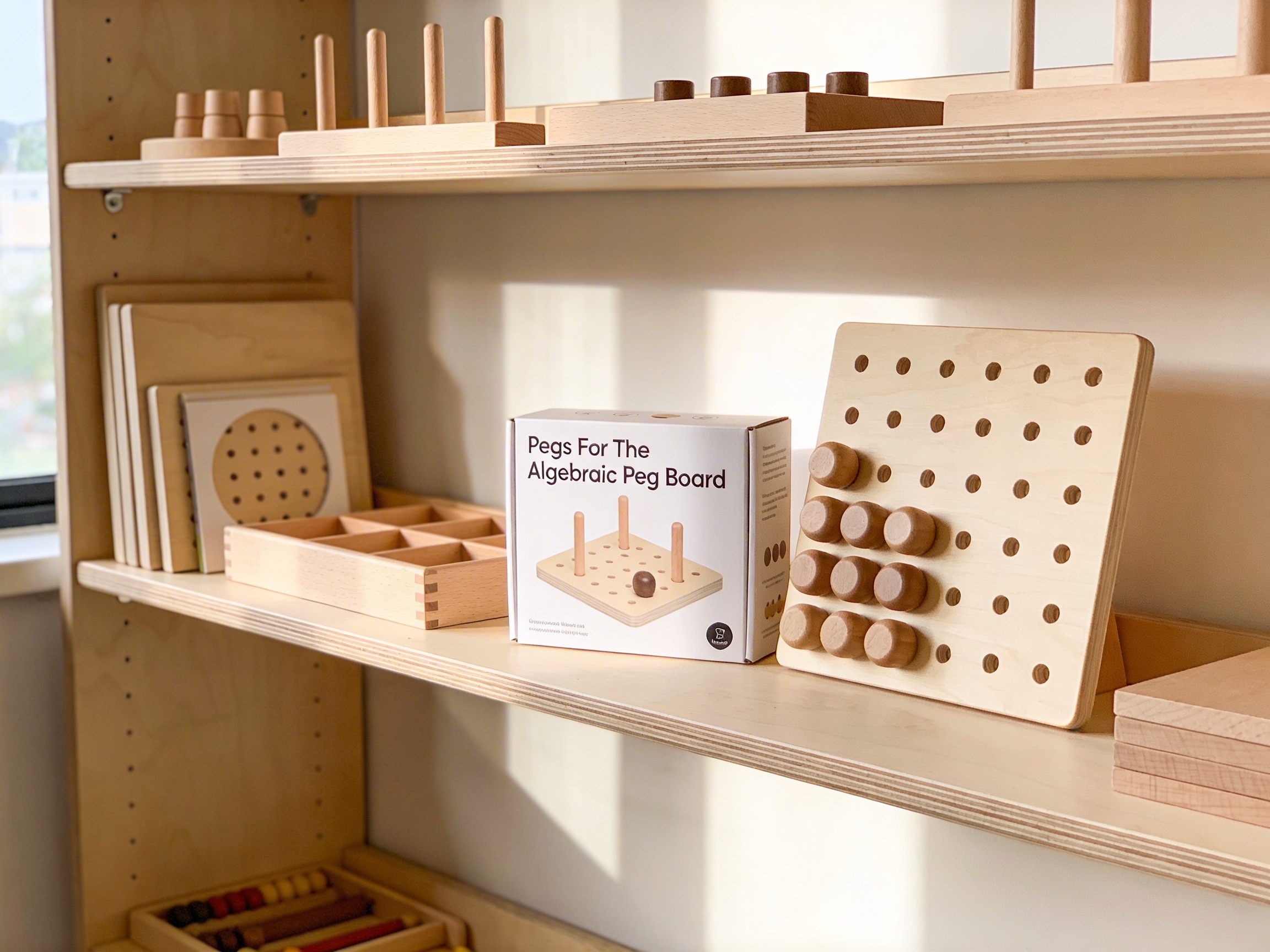 These pegs are designed for children ages 6-12, aligning with the Montessori elementary curriculum. They support the progression from concrete mathematical operations to abstract algebraic thinking, typically introduced in upper elementary when children are developmentally ready for pre-algebraic concepts.