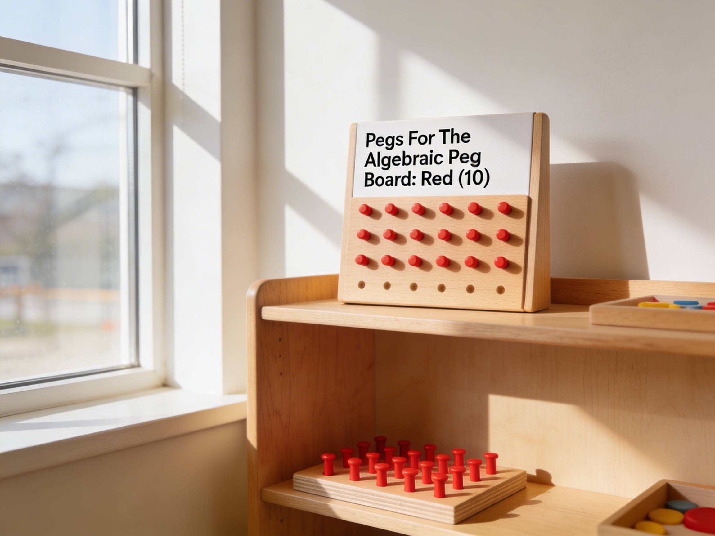 These red pegs are designed to work with the Montessori Algebraic Peg Board, helping children ages 3-6 develop early mathematical concepts through hands-on manipulation. They're used for creating patterns, practicing counting, sorting by color, and building foundational algebraic thinking through concrete representation.
