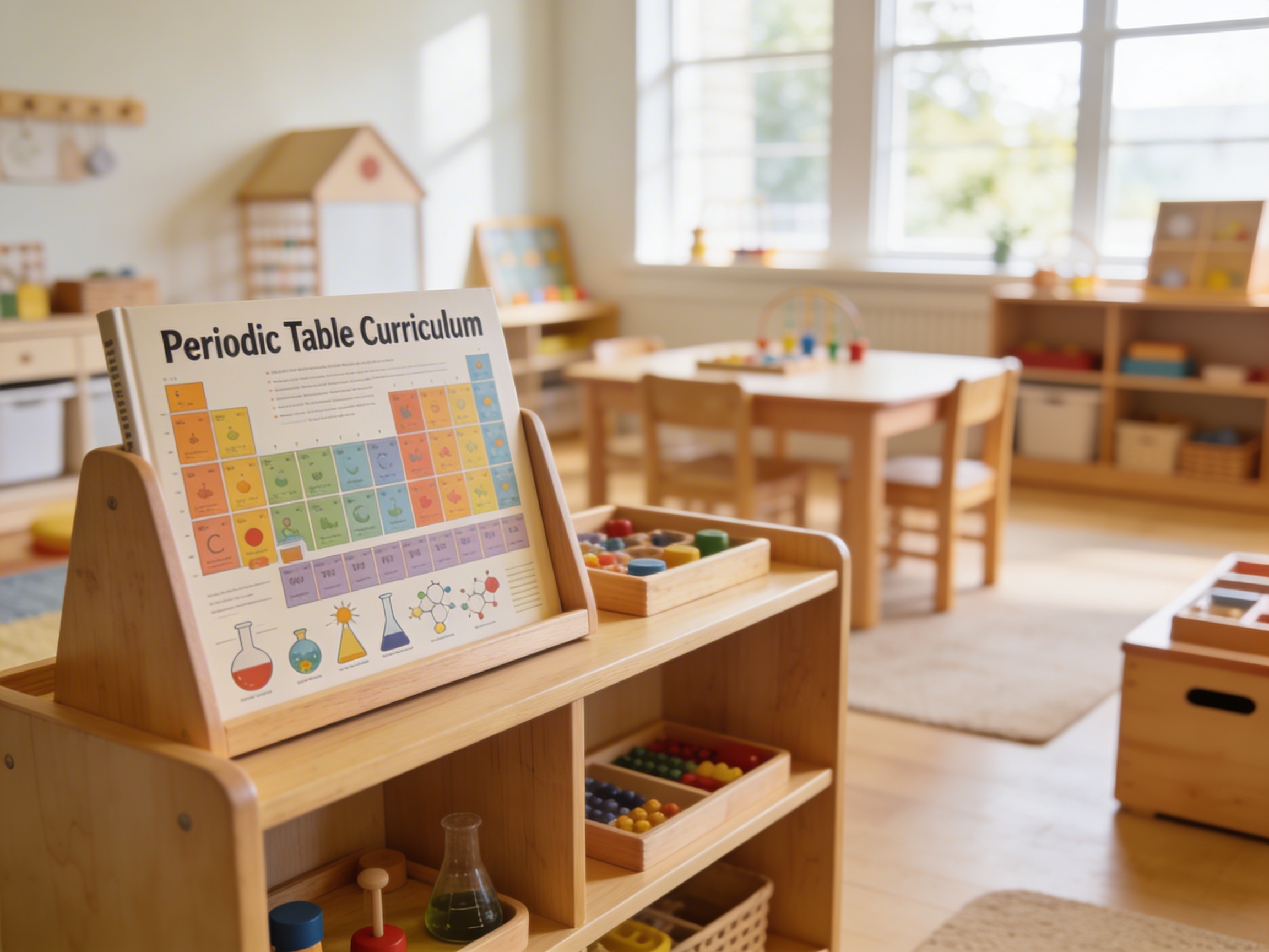 The Periodic Table Curriculum uses age-appropriate visual presentations with colorful elements, simple molecular structure illustrations, and hands-on activities. Children explore basic concepts like states of matter, common elements in everyday life, and the idea that everything is made of tiny building blocks, laying a foundation for later chemistry studies.