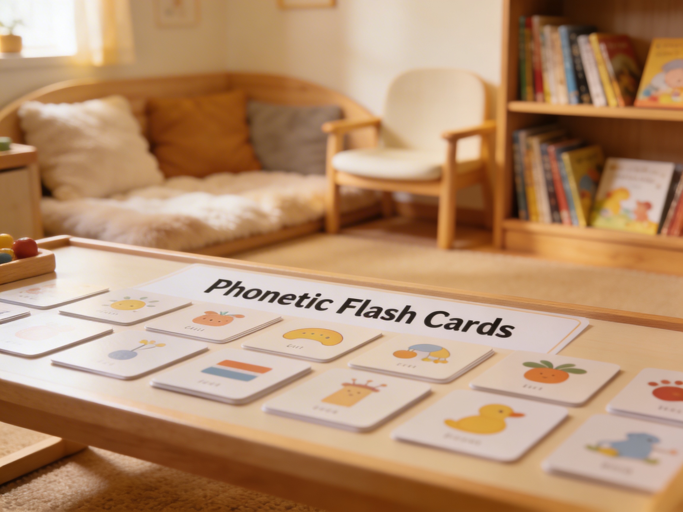 The Phonetic Flash Cards emerge during the sensitive period for language when children crave visual symbols to match the sounds they hear. These laminated cardstock rectangles with color-coded letters address the child's need to isolate and identify individual phonemes before blending them into words. The strategic use of color—distinguishing vowels from consonants on each card—provides a visual scaffold that helps children recognize patterns in word construction. The sans-serif typography on these flash cards offers clarity without distraction, allowing focus on the essential shape of each letter. This material bridges the gap between recognizing individual sandpaper letters and reading complete words, serving as a crucial intermediary step. The tactile quality of handling individual cards while pronouncing sounds engages multiple senses simultaneously. Each phonetic card becomes a concrete representation of an abstract sound, making the invisible auditory world visible and manipulable for young learners discovering the code of written language.