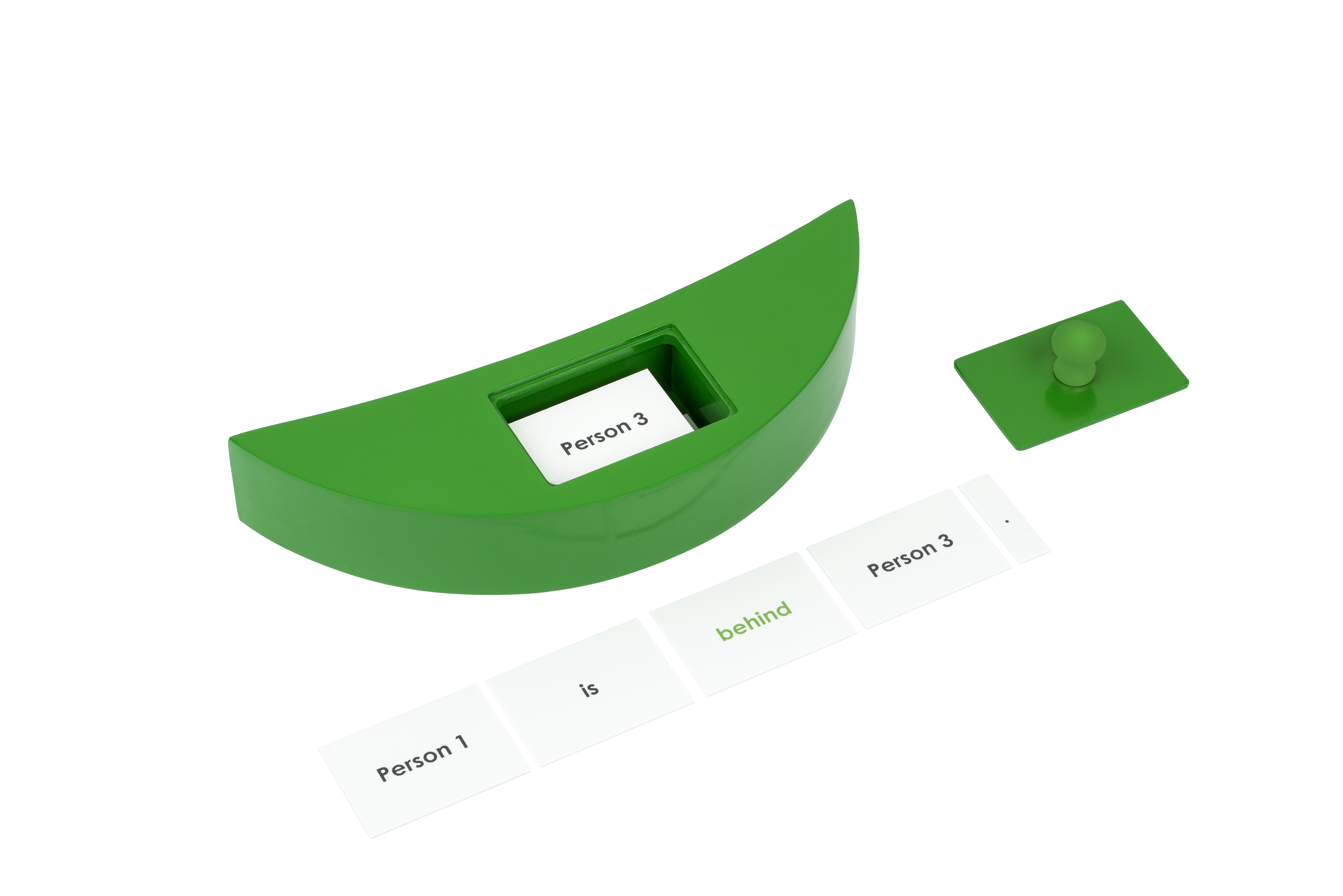 The Preposition Twister addresses children's need to understand spatial language during the sensitive period for vocabulary development. This curved card holder system makes invisible grammatical relationships visible by allowing children to physically manipulate preposition cards. The movable green marker serves as a concrete representation of objects in space, transforming abstract concepts like 'under,' 'beside,' and 'between' into tangible experiences. The Preposition Twister's unique curved design creates a three-dimensional workspace where children can construct and reconstruct sentences, observing how changing a single preposition card alters meaning. By moving the green marker to different positions relative to illustrated objects on the cards, children discover that prepositions are the words that show relationships in space. This hands-on manipulation of the Preposition Twister satisfies the child's drive to learn through movement while building essential language foundations.