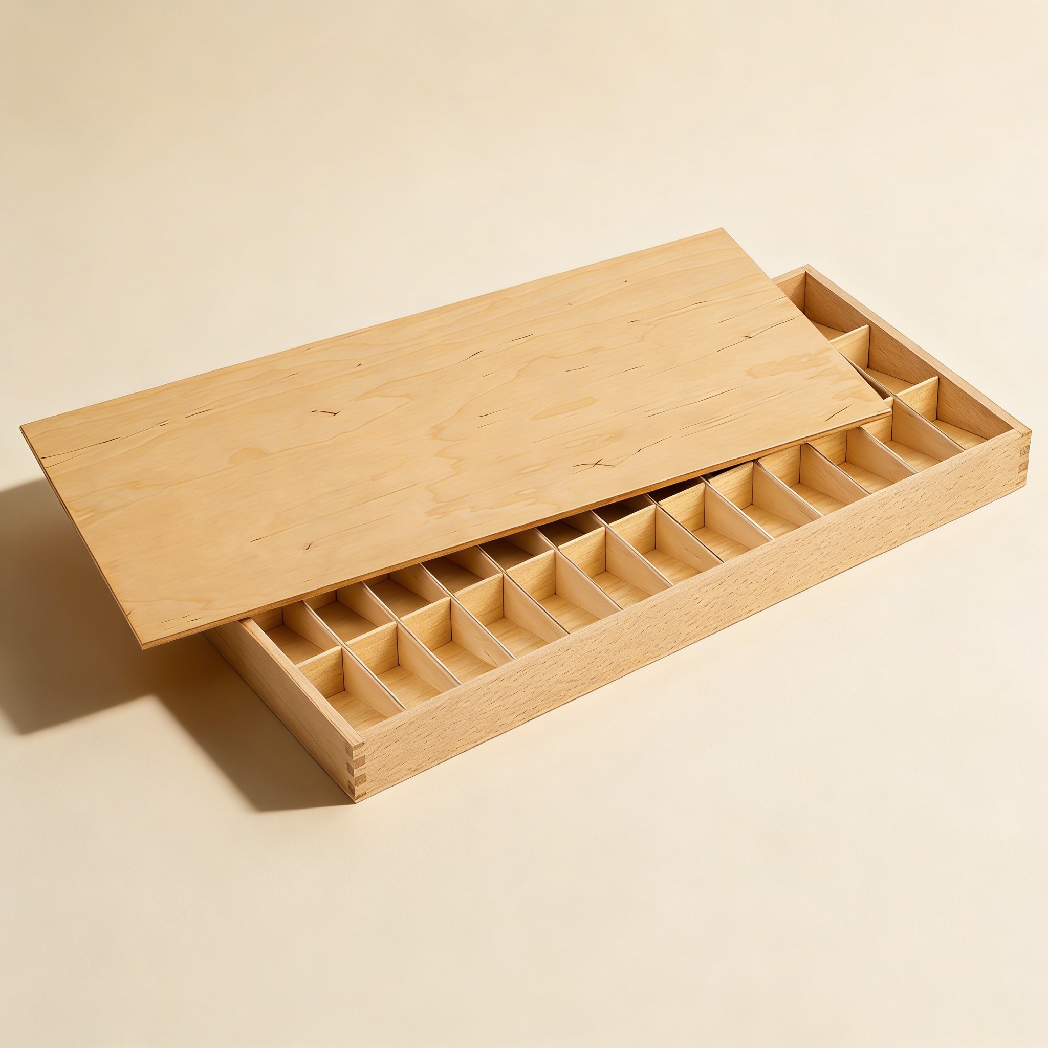 Each compartment is precisely sized to hold wooden or plastic moveable alphabet letters typically measuring 3-5cm in height. The compartments are deep enough to stack multiple copies of each letter while shallow enough for small hands to easily retrieve them.