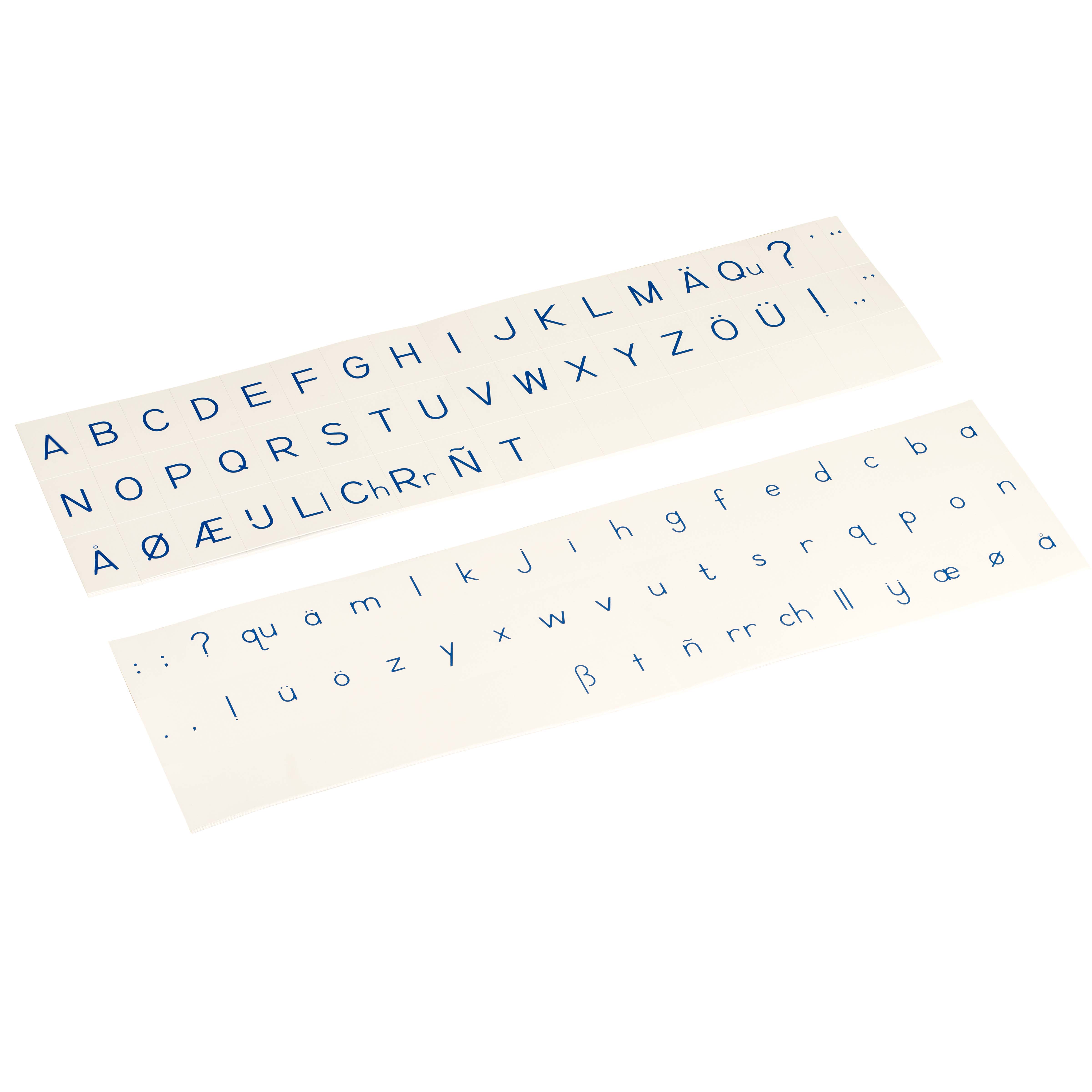 These professional printed alphabet strips present the International Print font in clear blue lettering, featuring both uppercase and lowercase letters on durable laminated cardstock. Designed for the Montessori language curriculum, these strips support letter recognition, phonetic work, and early reading preparation through consistent visual presentation of the alphabet.