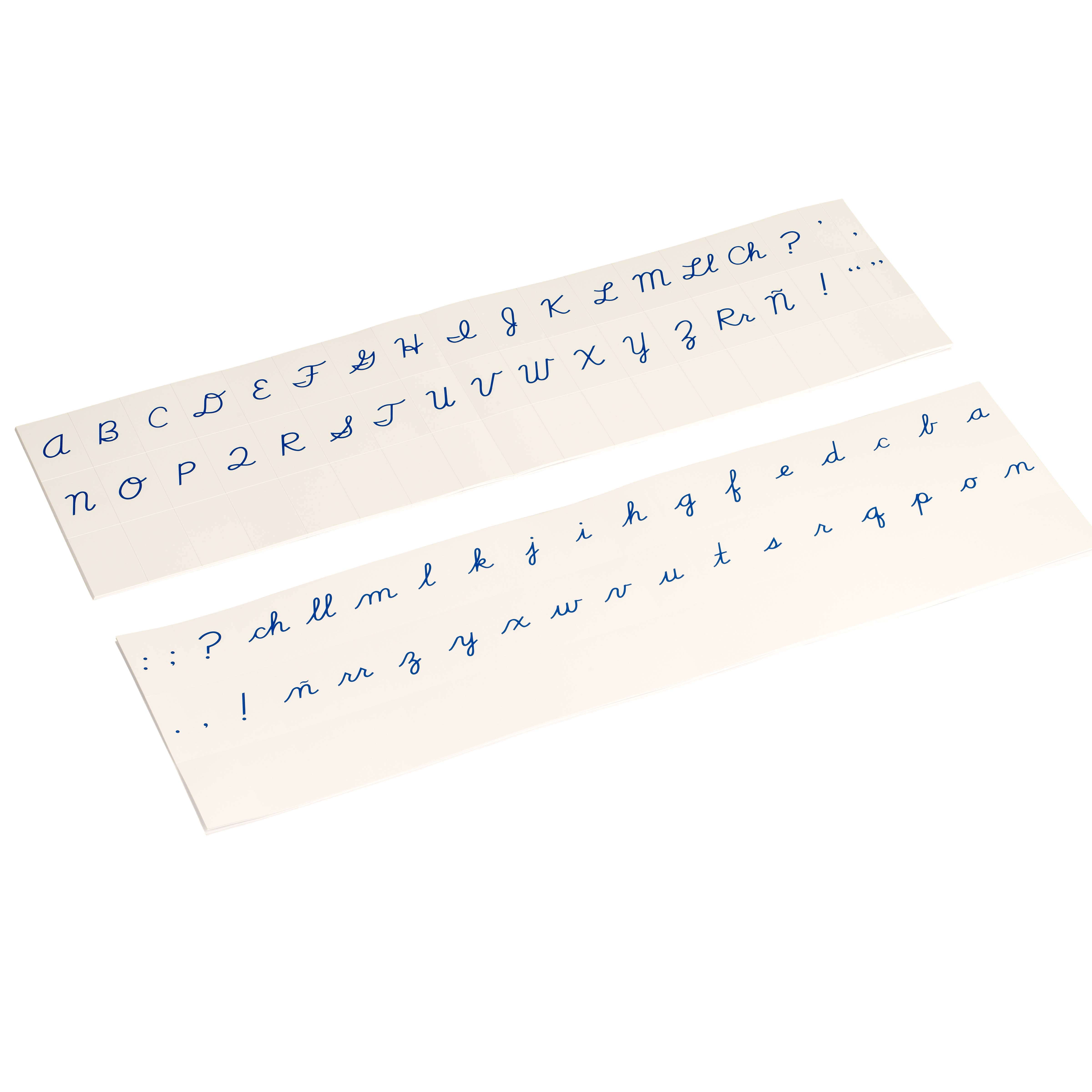 The Printed Alphabet: US Cursive - Blue represents Montessori's understanding that cursive writing develops naturally when children have proper visual models. These elegant blue script cards on cream-colored cardstock serve as the child's constant reference point for letter formation, addressing the developmental need for beauty and precision in written expression. Maria Montessori observed that children between 6-12 years possess a heightened sensitivity to cultural refinement, making cursive alphabet cards essential for this plane of development. The blue cursive letters provide clear exemplars of proper letter connections and proportions, allowing children to internalize correct formations through repeated visual exposure. By displaying these US Cursive cards prominently in the environment, we honor the child's desire for sophisticated communication tools. The cream-colored cardstock background creates optimal contrast for the blue script, supporting visual discrimination as children trace letter paths with their eyes before attempting reproduction.