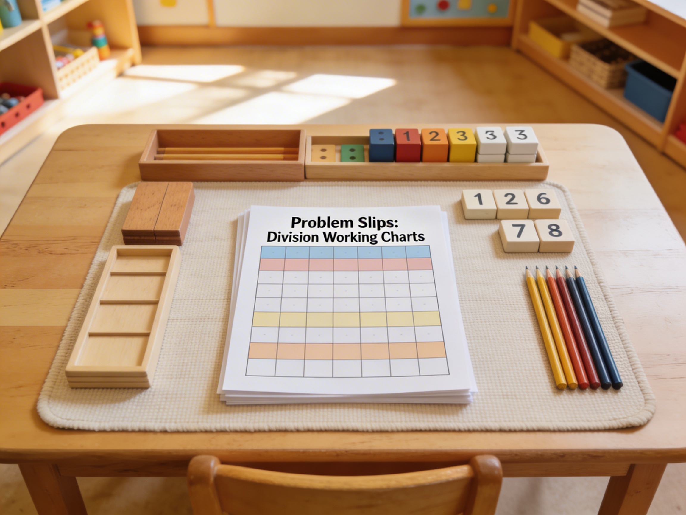 The Problem Slips: Division Working Charts is a Mathematics Montessori material designed for children aged 3-6, crafted by Nienhuis Montessori to AMI standards.