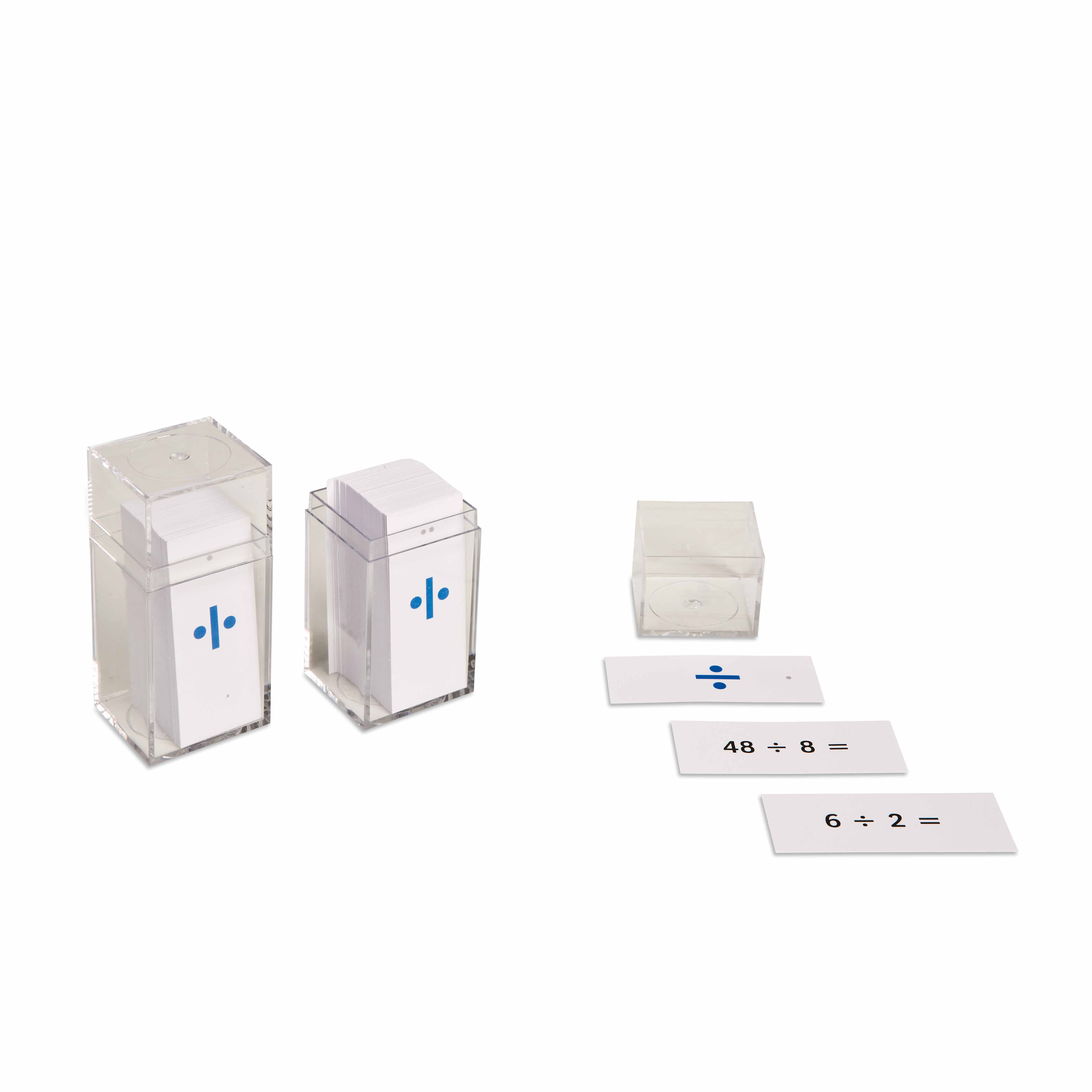 The slips are organized in clear acrylic containers marked with blue division symbols, with each container holding problem cards for specific division tables. This organization allows children to work systematically through each divisor, building confidence and fluency with one set before moving to the next.