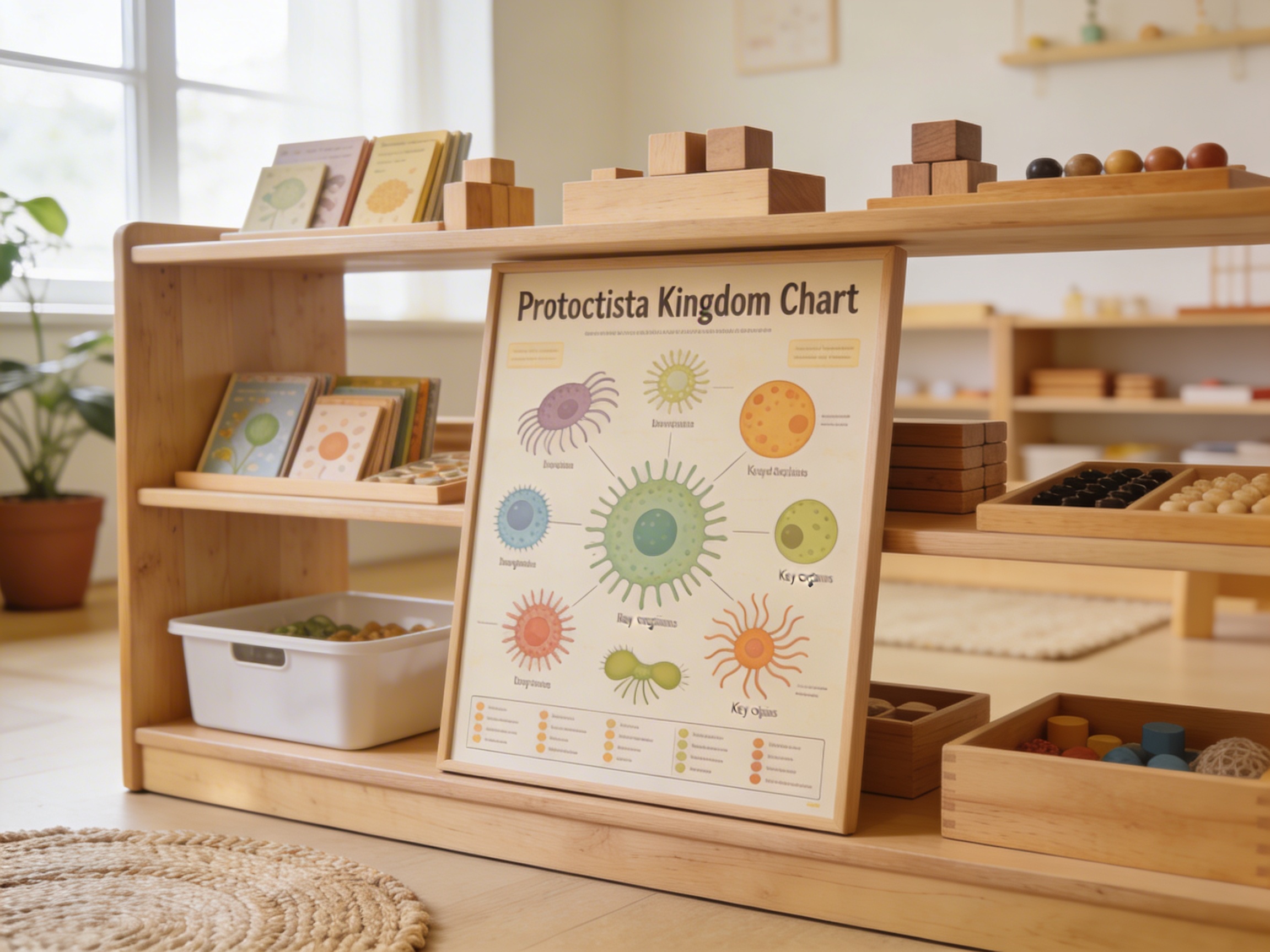 The Protoctista Kingdom Chart introduces children to the fascinating world of single-celled organisms, algae, and other protists through clear visual representations. This educational chart supports the Montessori approach to scientific classification, helping children aged 3-6 understand the diversity of microscopic life forms as part of their broader study of the natural world.