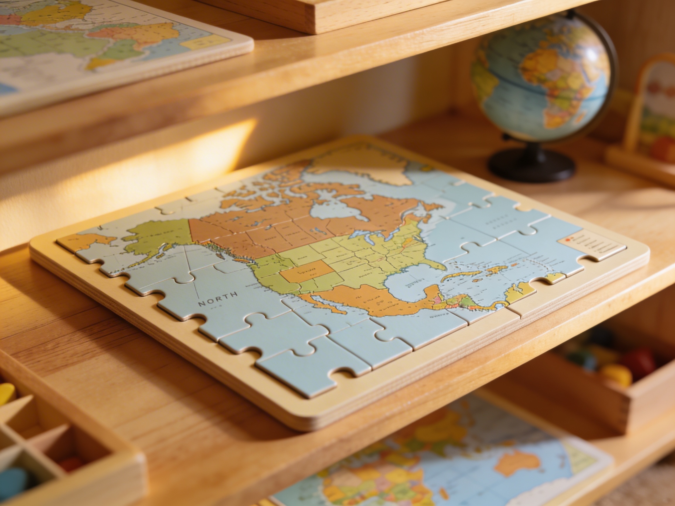 The Puzzle Map: North America transforms abstract continental boundaries into concrete, manipulable pieces that children can hold, trace, and position. Each wooden country piece with its knob handle invites repeated exploration, allowing children to build mental maps through sensorial experience rather than memorization. The puzzle's yellow border frame creates a clear visual boundary that helps young learners understand North America as a distinct continental unit within the larger world. Through removing and replacing each country piece, children internalize spatial relationships between Mexico, Canada, the United States, and Central American nations. The color-coding of each wooden piece creates visual associations that persist in the child's memory, making later abstract map work meaningful. This puzzle map addresses the young child's need to understand their place in the world through concrete manipulation before moving to abstract representation.