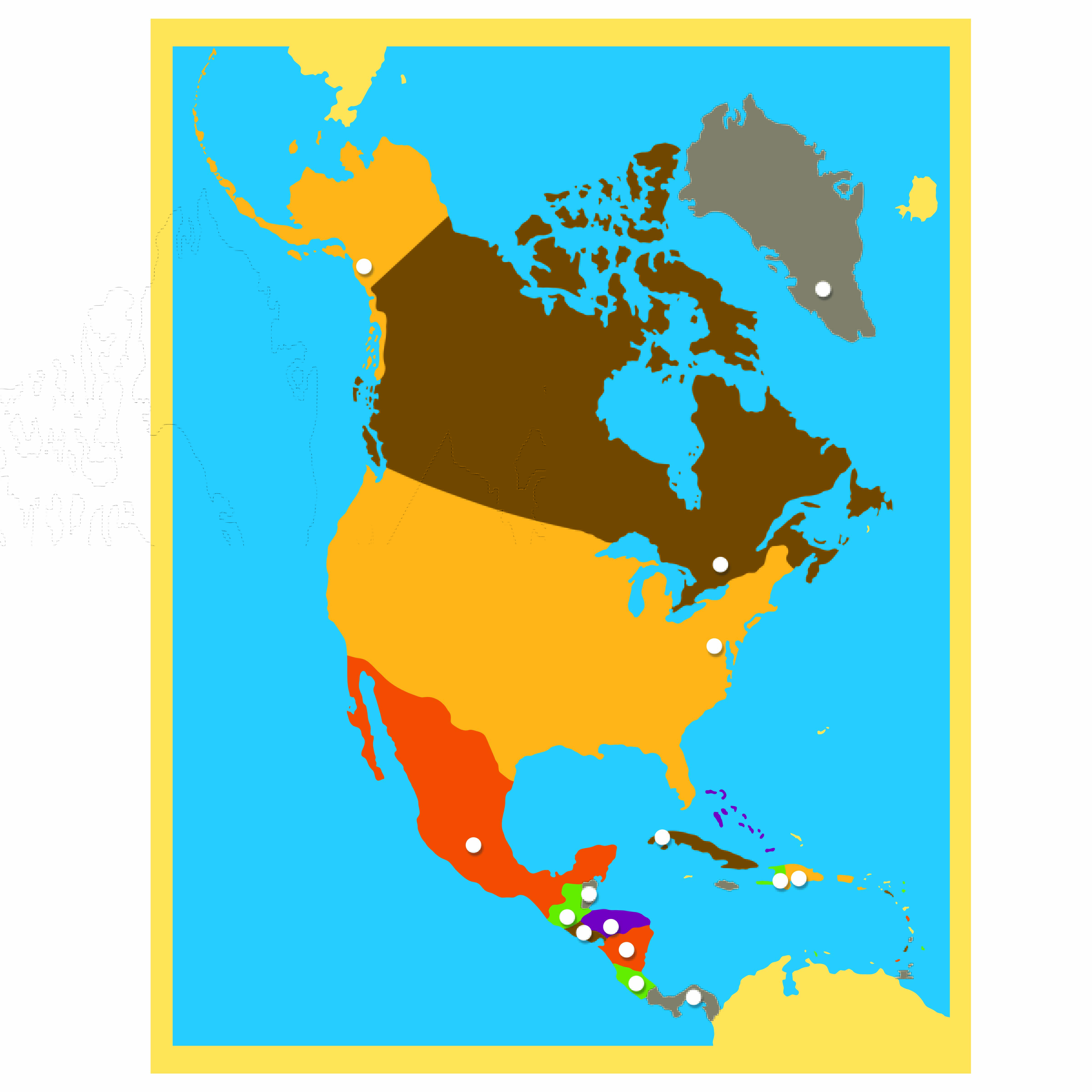 The yellow border frame serves multiple purposes: it defines the continental boundaries of North America, provides a visual framework for the puzzle pieces, and helps children understand the concept of continents as distinct geographical areas.