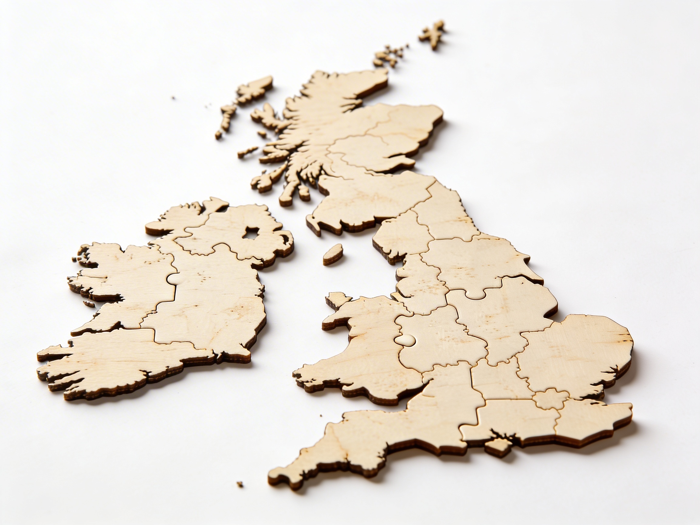 This precisely crafted wooden puzzle map introduces children to the geography of the United Kingdom and Ireland through hands-on exploration. Each country and region is represented as a removable piece with a white knob handle, enabling children to trace borders, identify locations, and develop spatial awareness while building their understanding of these nations' political divisions.