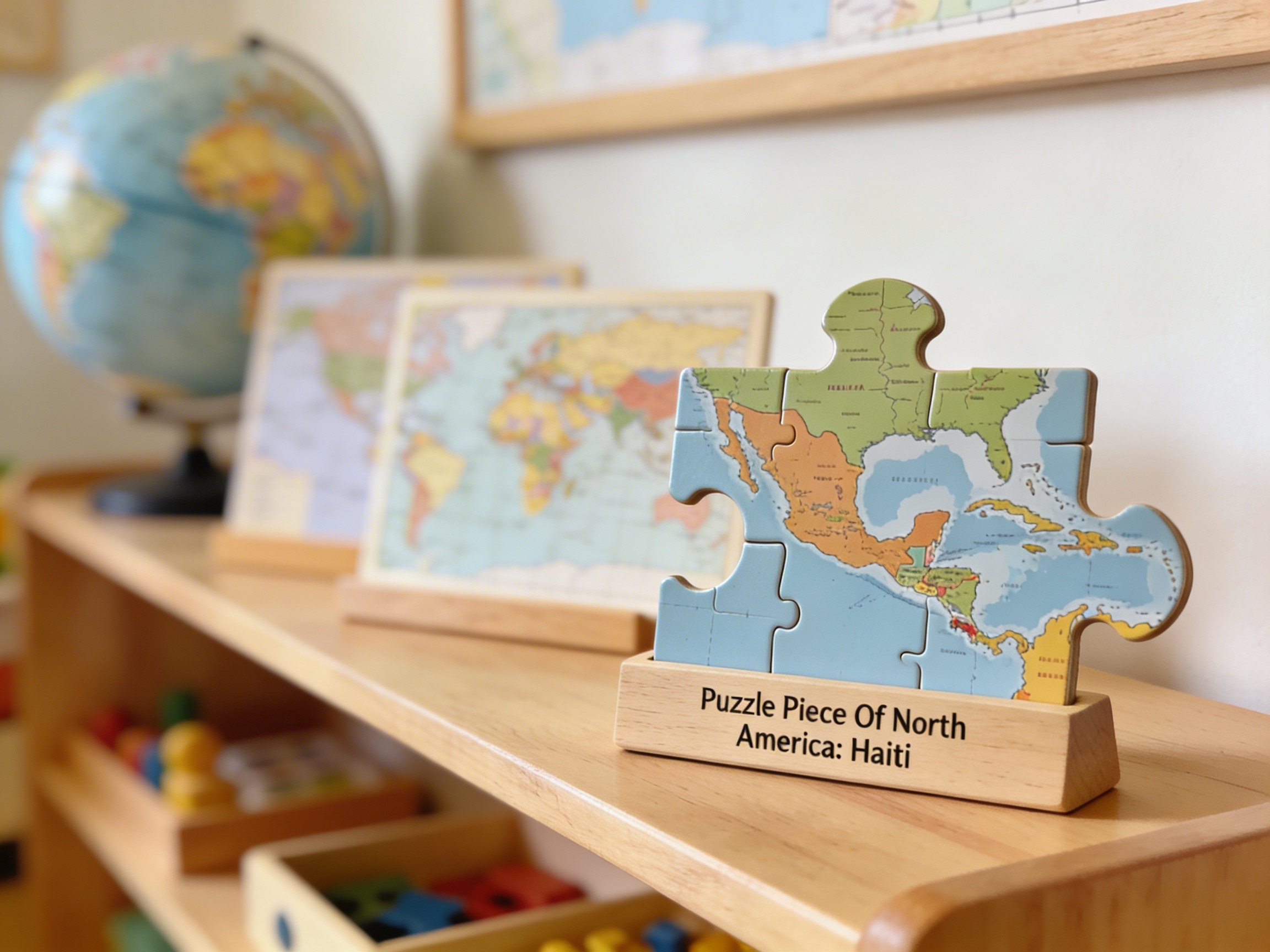 Following Montessori principles, this concrete material allows children to physically handle and explore Haiti's shape and position. The tactile experience helps children internalize geographic concepts through sensorial learning, moving from concrete to abstract understanding.