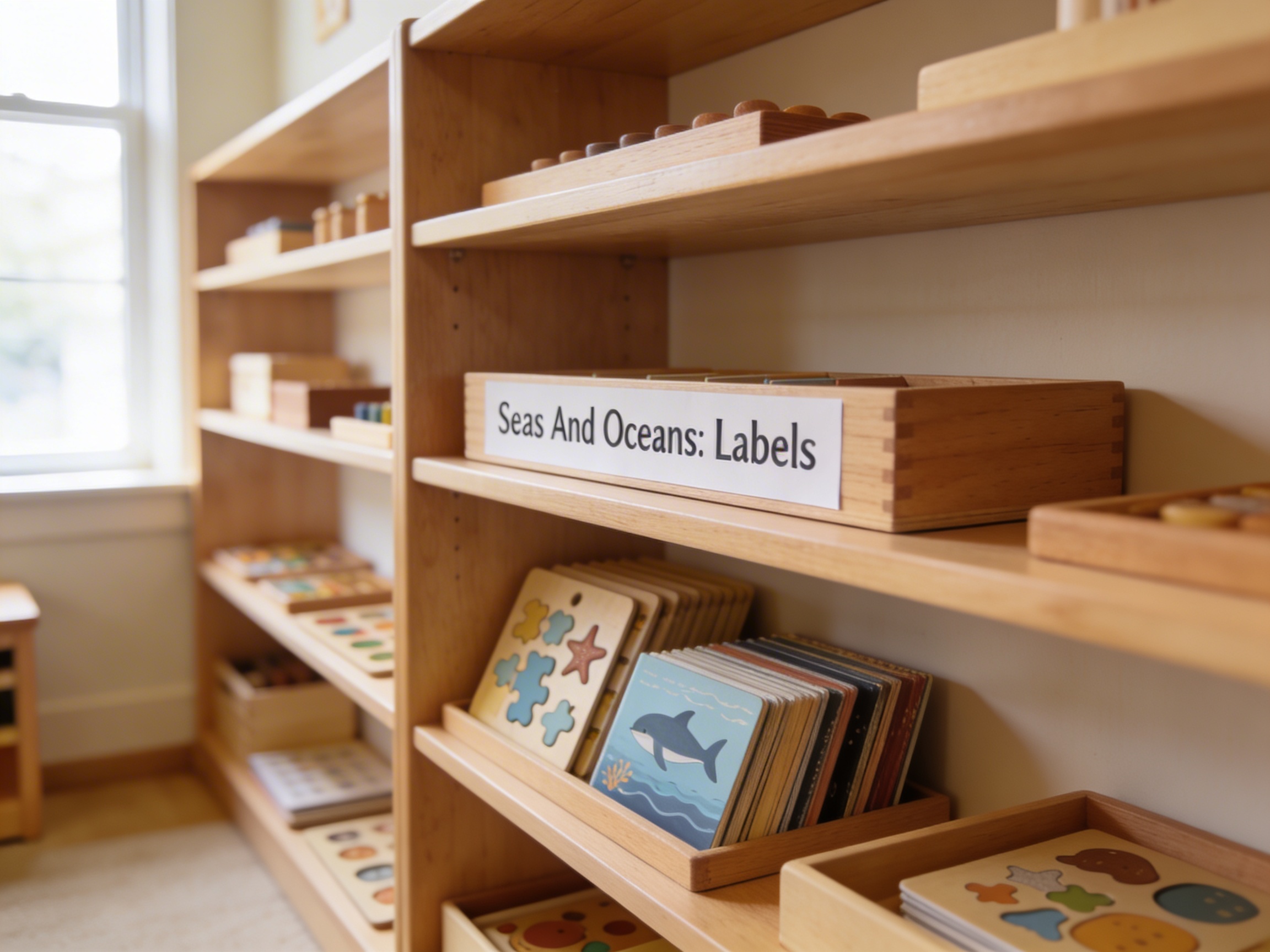 The Seas And Oceans: Labels is a Educational Materials Montessori material designed for children aged 3-6, crafted by Nienhuis Montessori to AMI standards.