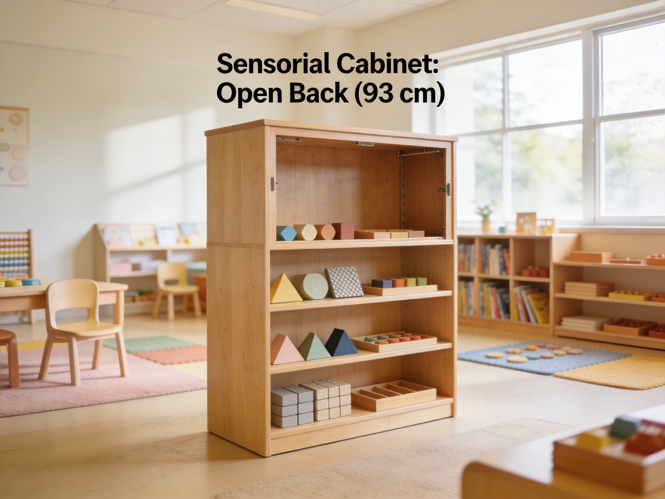 The Sensorial Cabinet with its 93cm height and open-back design creates a prepared environment where sensorial materials remain visible and accessible throughout the classroom day. This cabinet's four shelves positioned at child height enable independent selection and return of materials, fostering the development of order and responsibility. The open-back construction allows teachers to observe material selection from multiple classroom positions while children access materials from either side, promoting natural movement patterns. The raised edge on top of this cabinet serves as a dedicated preparation space where teachers can arrange materials before presentations or children can organize their chosen work. By housing sensorial materials in this specialized cabinet, the classroom maintains the aesthetic order essential for concentration while making each material equally inviting and available for exploration.