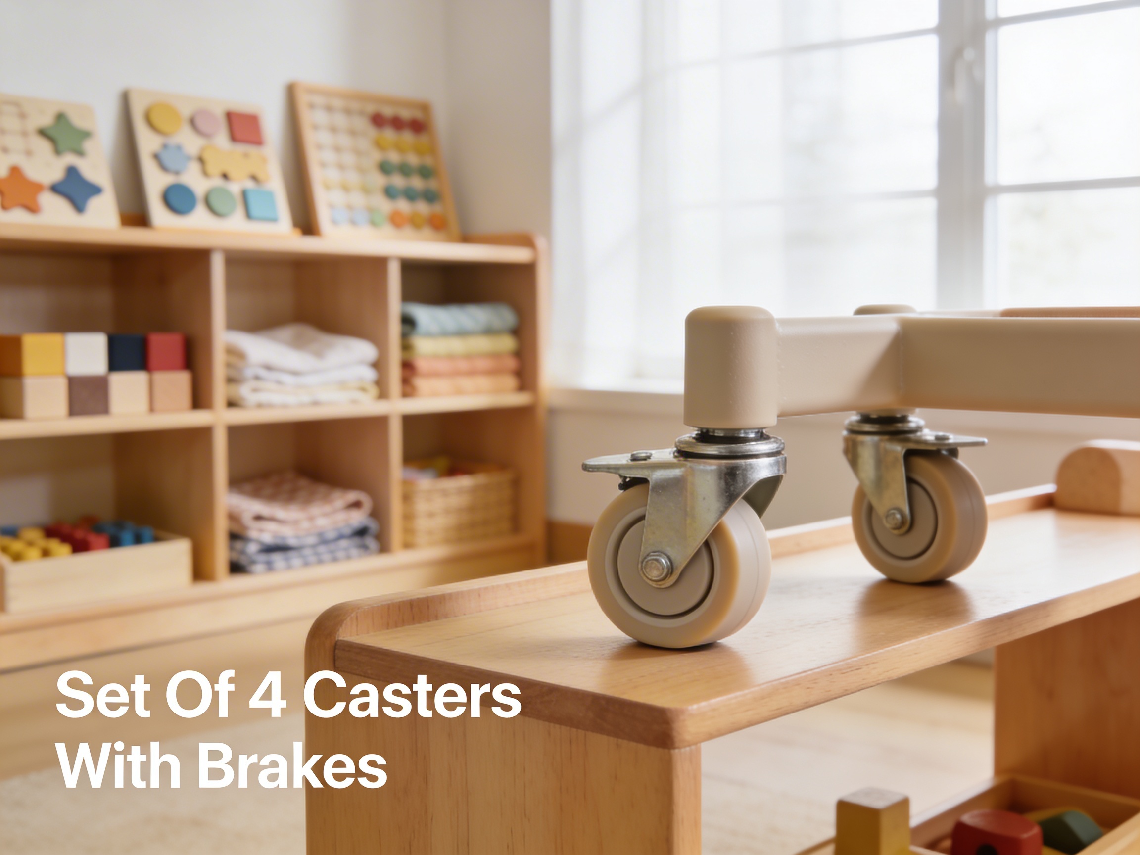 The Set of 4 Casters with Brakes transforms static classroom furniture into dynamic, adaptable elements that respond to children's changing needs throughout the day. These heavy-duty wheels allow shelving units to glide smoothly into new configurations, creating distinct work areas or opening space for movement activities. The reliable locking mechanisms on each caster ensure that once positioned, furniture remains stable and secure during concentrated work periods. This mobility feature directly addresses the Montessori principle of the prepared environment adapting to children rather than children adapting to fixed spaces. The rubber wheels maintain the classroom's peaceful atmosphere by moving quietly across floors, preserving the concentration of children engaged in their work. By enabling furniture repositioning, these casters empower educators to modify the environment based on observed interests, creating intimate reading corners, collaborative work spaces, or clear areas for group presentations as needed.