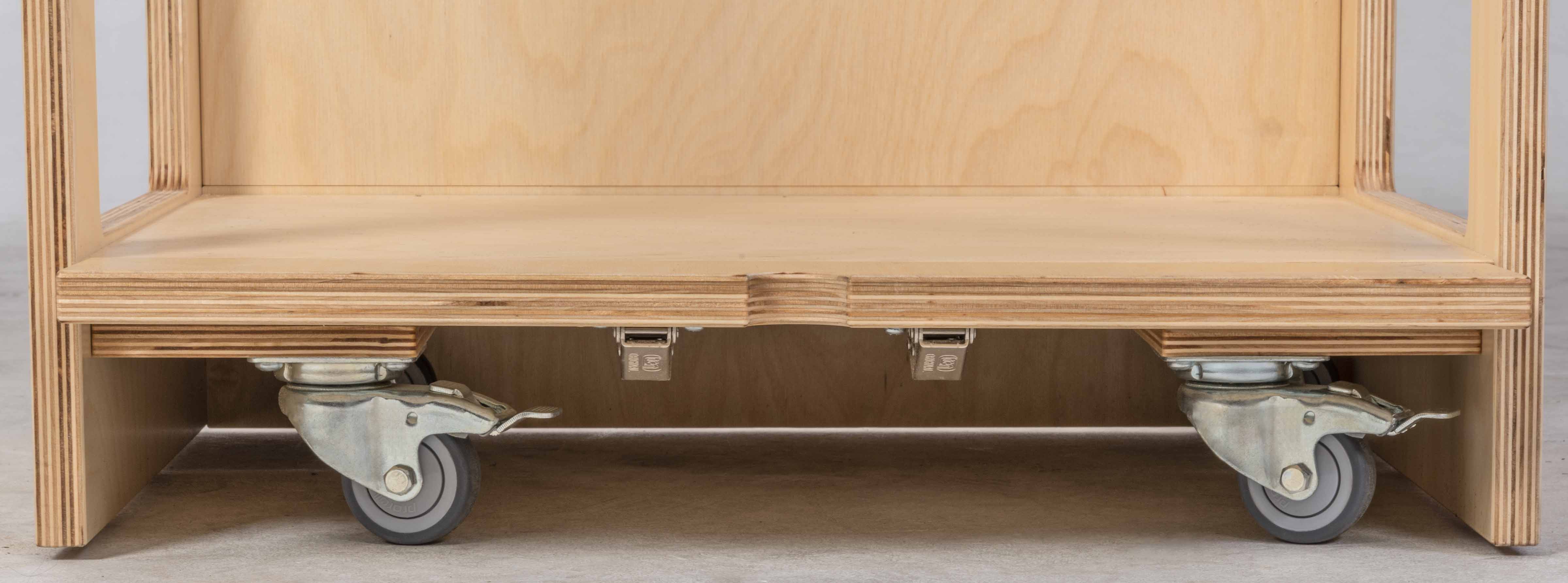 These heavy-duty casters are designed for Montessori classroom furniture including shelving units up to 150kg, material display stands, practical life stations, and mobile work tables typically used in 3-6 environments.