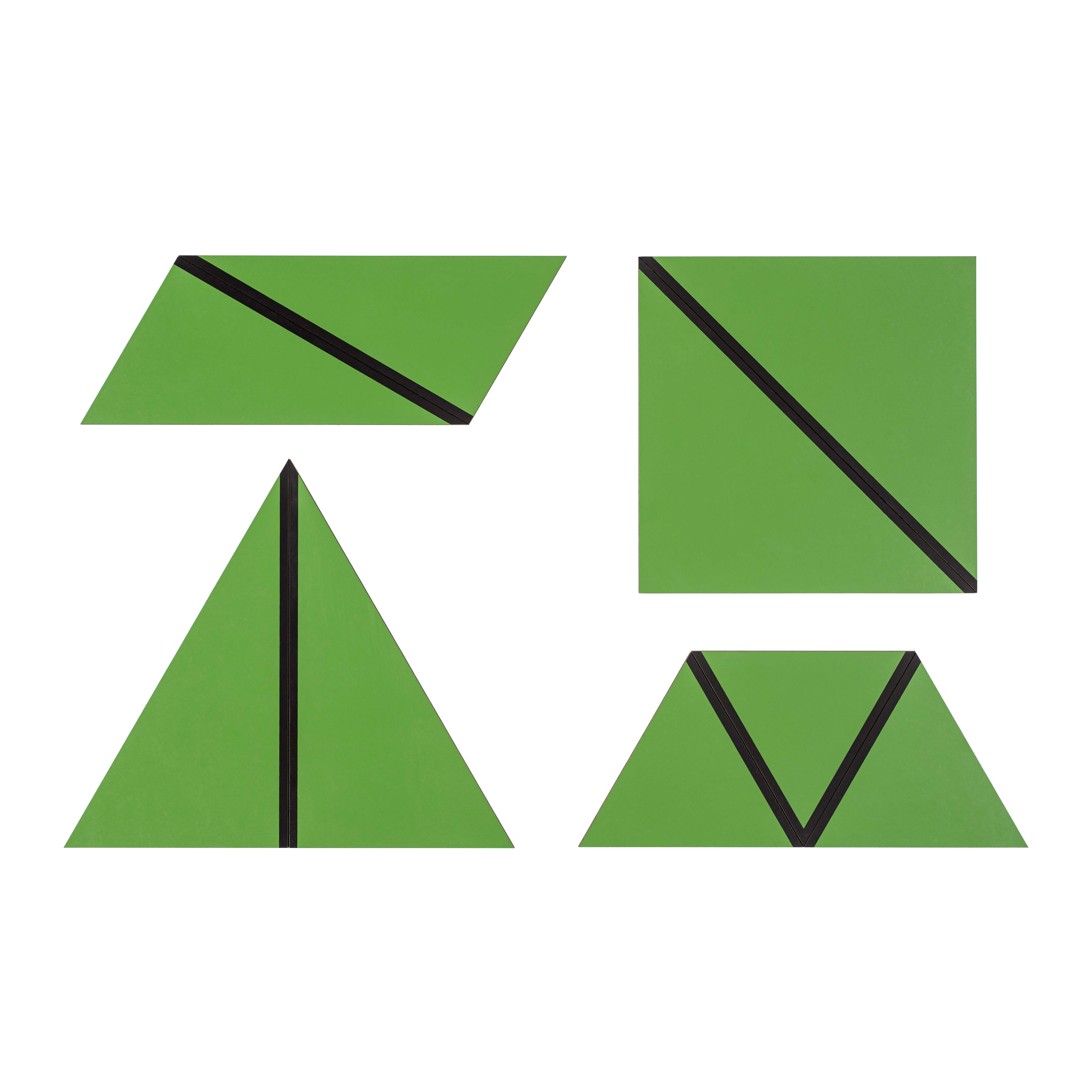 The Set of Green Constructive Triangles introduces children to fundamental geometric relationships through hands-on exploration. Each precisely crafted wooden shape features strategic black guide lines that help children discover how different geometric forms can combine to create new shapes. This essential Sensorial material builds spatial reasoning and prepares the mathematical mind through concrete manipulation of plane geometry.