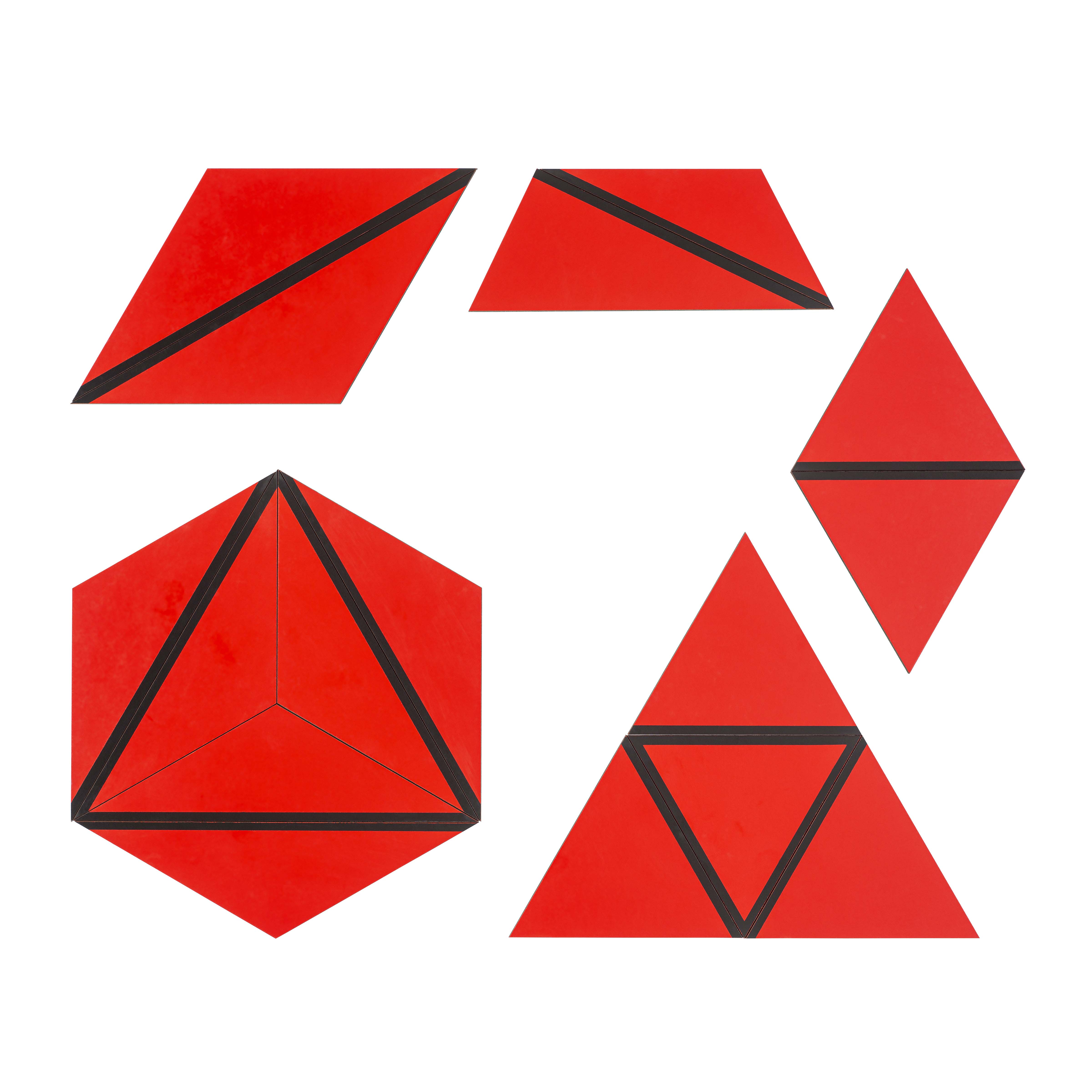 The Red Constructive Triangles exist in the Montessori classroom as a bridge between sensorial exploration and mathematical understanding. Each red wooden triangle's black border serves as a visual control, showing children exactly where edges should meet when forming new shapes. This material addresses the child's developmental need to understand how parts create wholes - a fundamental concept for later geometry. The red triangles specifically introduce the principle that all straight-sided figures can be constructed from triangles, preparing the mathematical mind through concrete manipulation. Unlike pattern blocks or puzzles with predetermined solutions, these triangles allow unlimited exploration of geometric relationships. The precise craftsmanship of each wooden piece ensures edges align perfectly, providing immediate feedback when children discover that two right triangles form a square or that specific triangular combinations create hexagons. This material reveals mathematical laws through the child's own discoveries rather than through instruction.
