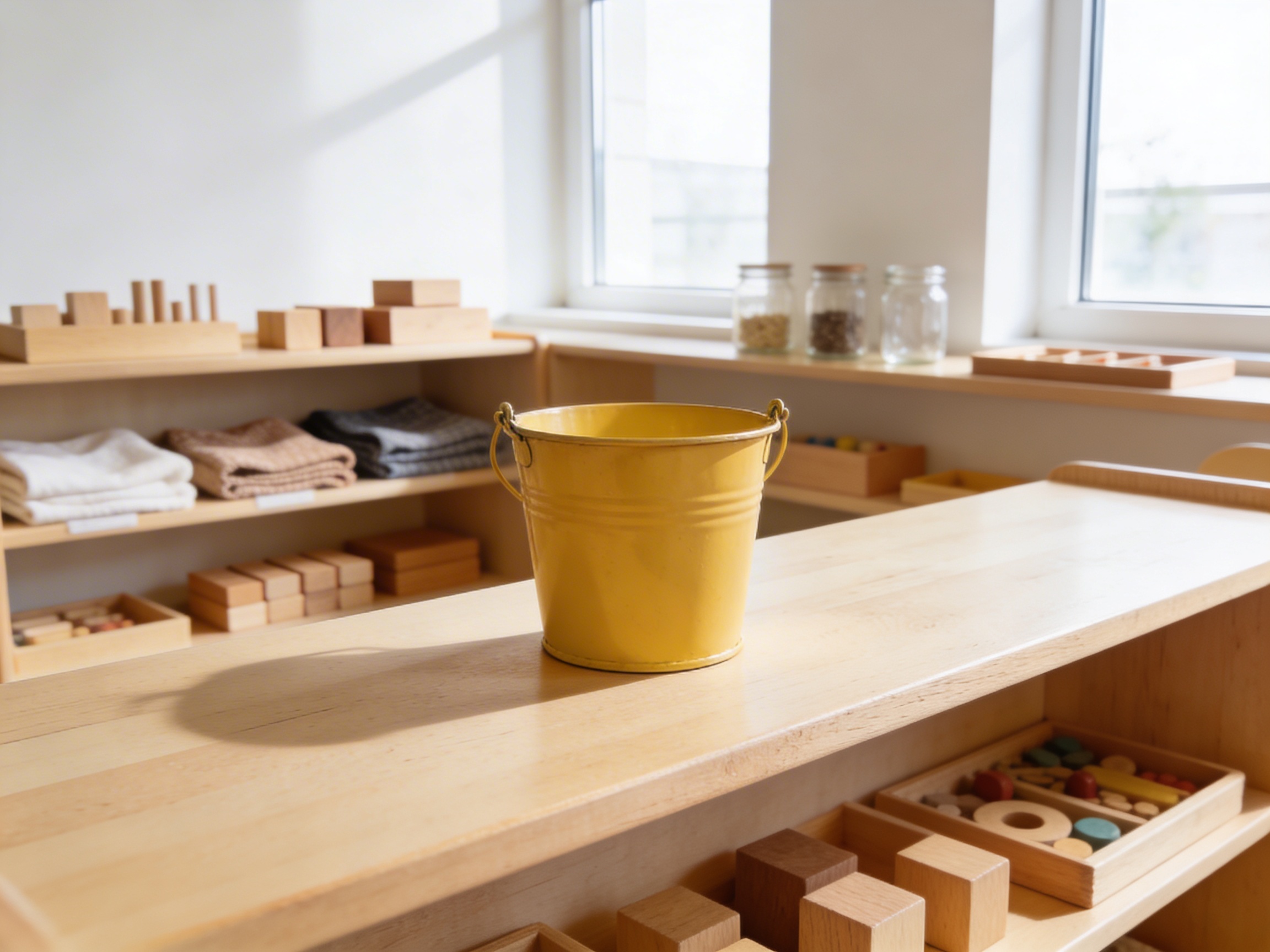 The bright yellow color provides strong visual appeal and helps with object recognition and tracking. It makes the bucket easy to locate in the classroom, supports color identification learning, and adds an engaging element that encourages children to participate in practical life work.