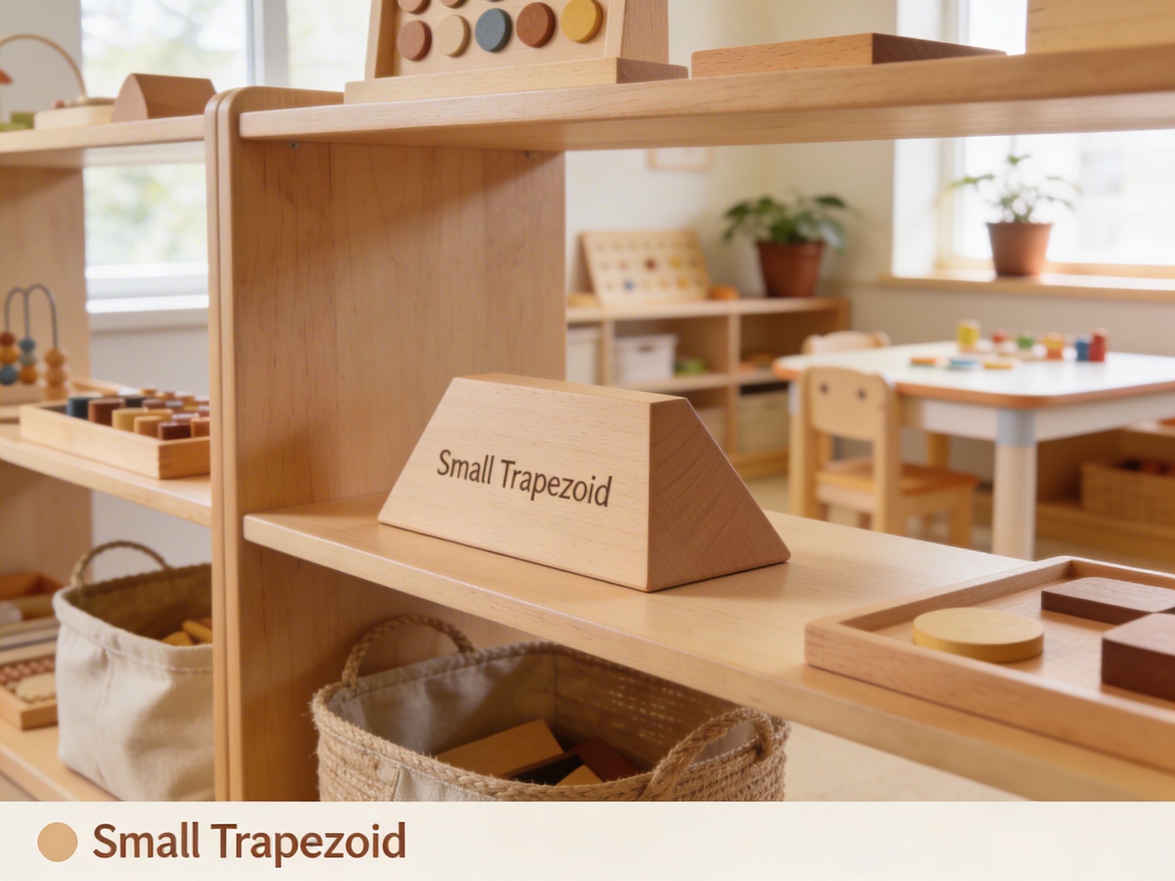 The Small Trapezoid teaches quadrilateral properties, parallel lines, angles, spatial relationships, and geometric vocabulary. Children learn to identify trapezoid characteristics, understand how shapes relate to each other, and develop visual discrimination skills through hands-on manipulation.
