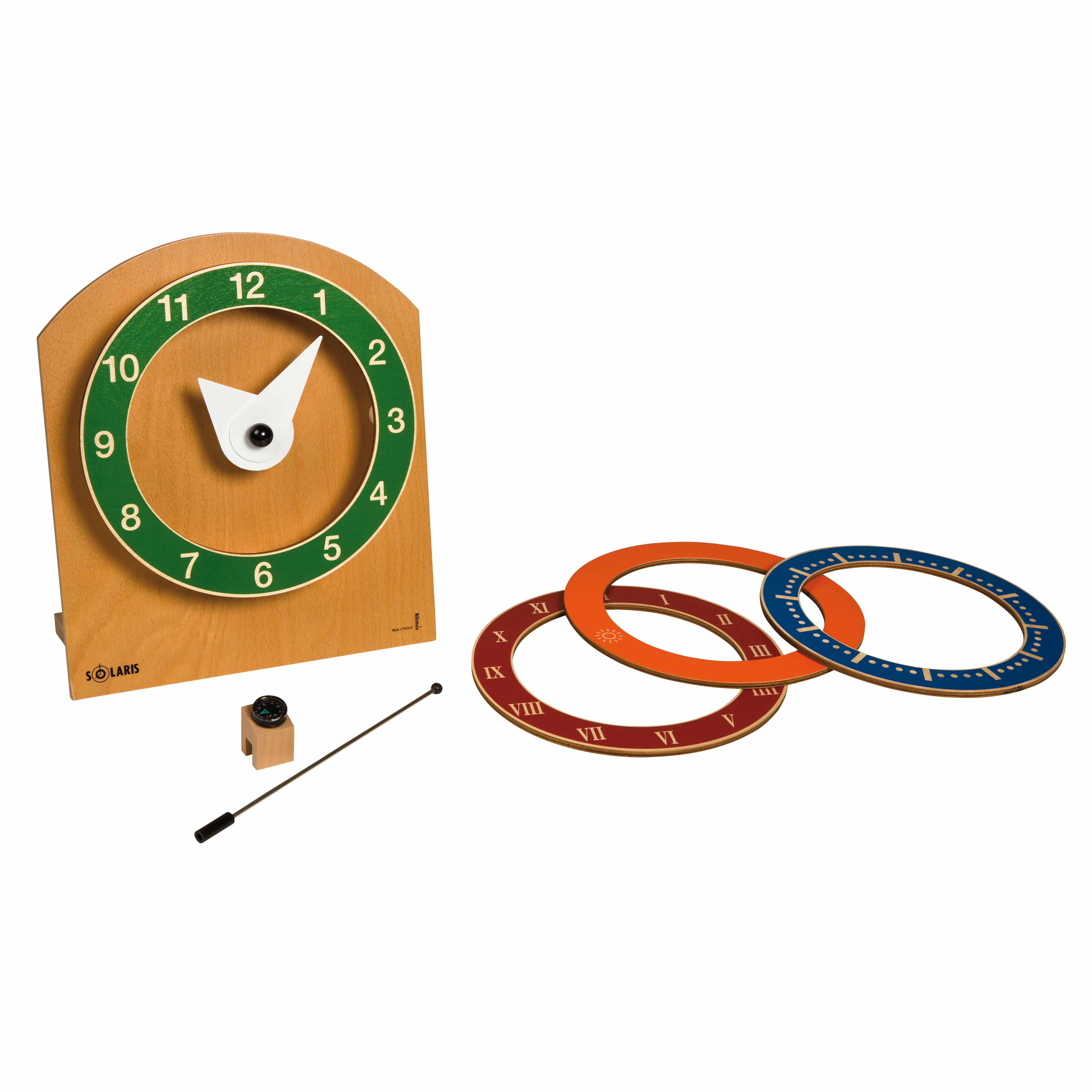 The Solaris includes a wooden base clock with three interchangeable number rings featuring standard numbers, Roman numerals, and alternative numerical representations for comprehensive time-telling exploration.