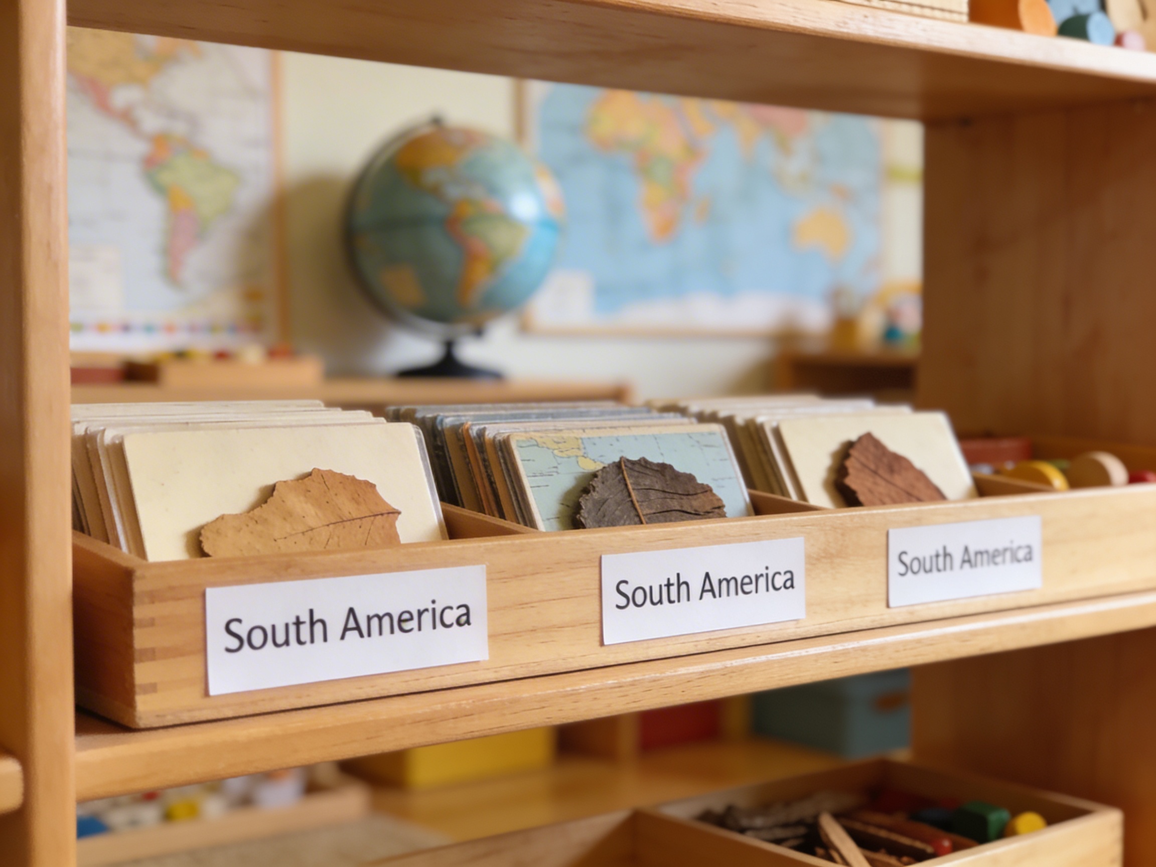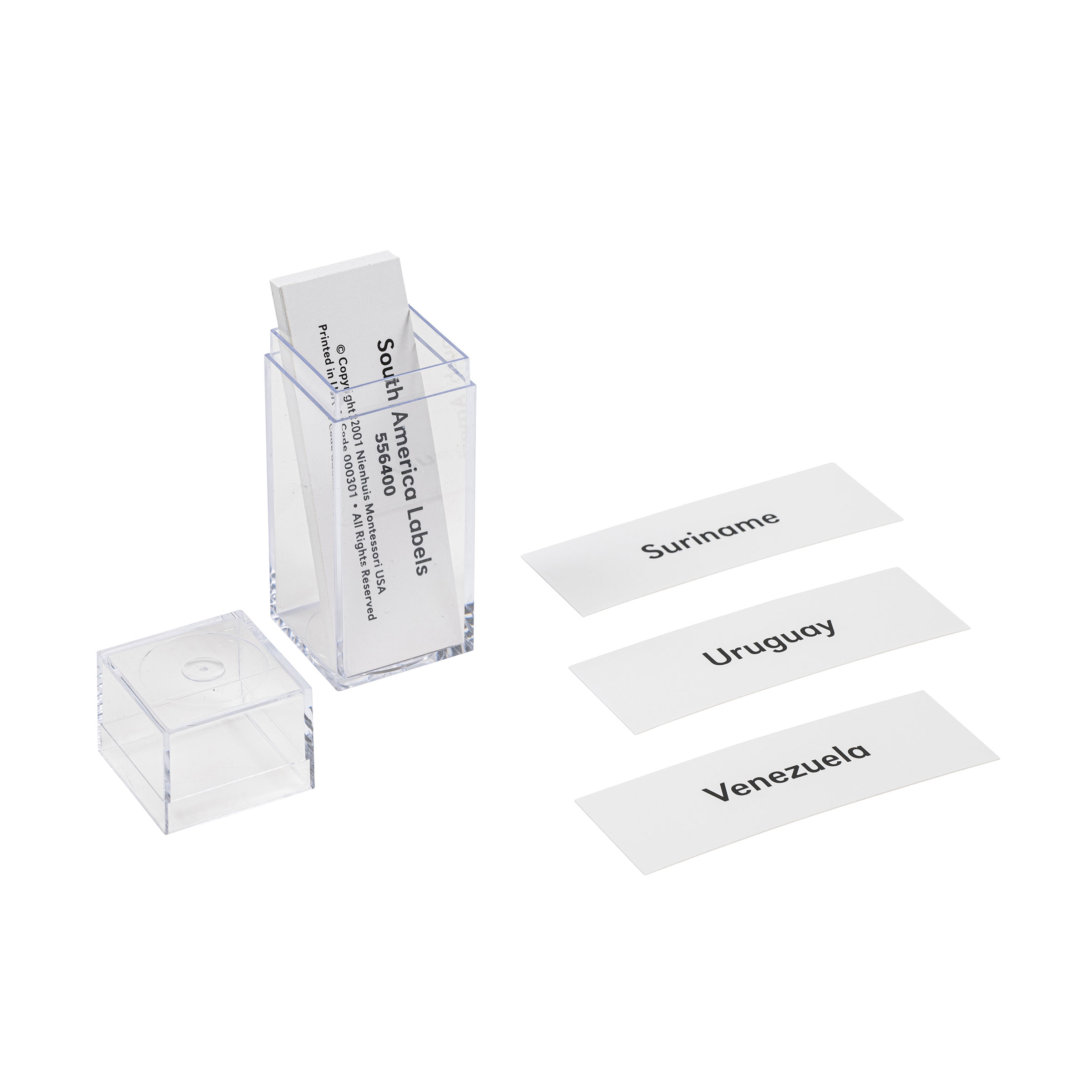 The South America Labels introduce written language to geographical discovery, bridging the child's sensorial exploration with abstract country names. These cardstock labels fulfill the child's need to name and classify their world during the sensitive period for language between ages 3-6. When a child matches these printed labels to puzzle pieces or control charts, they construct mental maps connecting symbols to territories. The labels' portable acrylic container allows children to transport their geography work between shelf and workspace independently. Each label becomes a key unlocking the child's understanding of South American nations through repeated handling and matching. The durable cardstock withstands countless small fingers tracing country names while building reading readiness. Through these labels, abstract political boundaries become concrete learning experiences as children discover that Brazil spans vast territories while Uruguay occupies a smaller space.