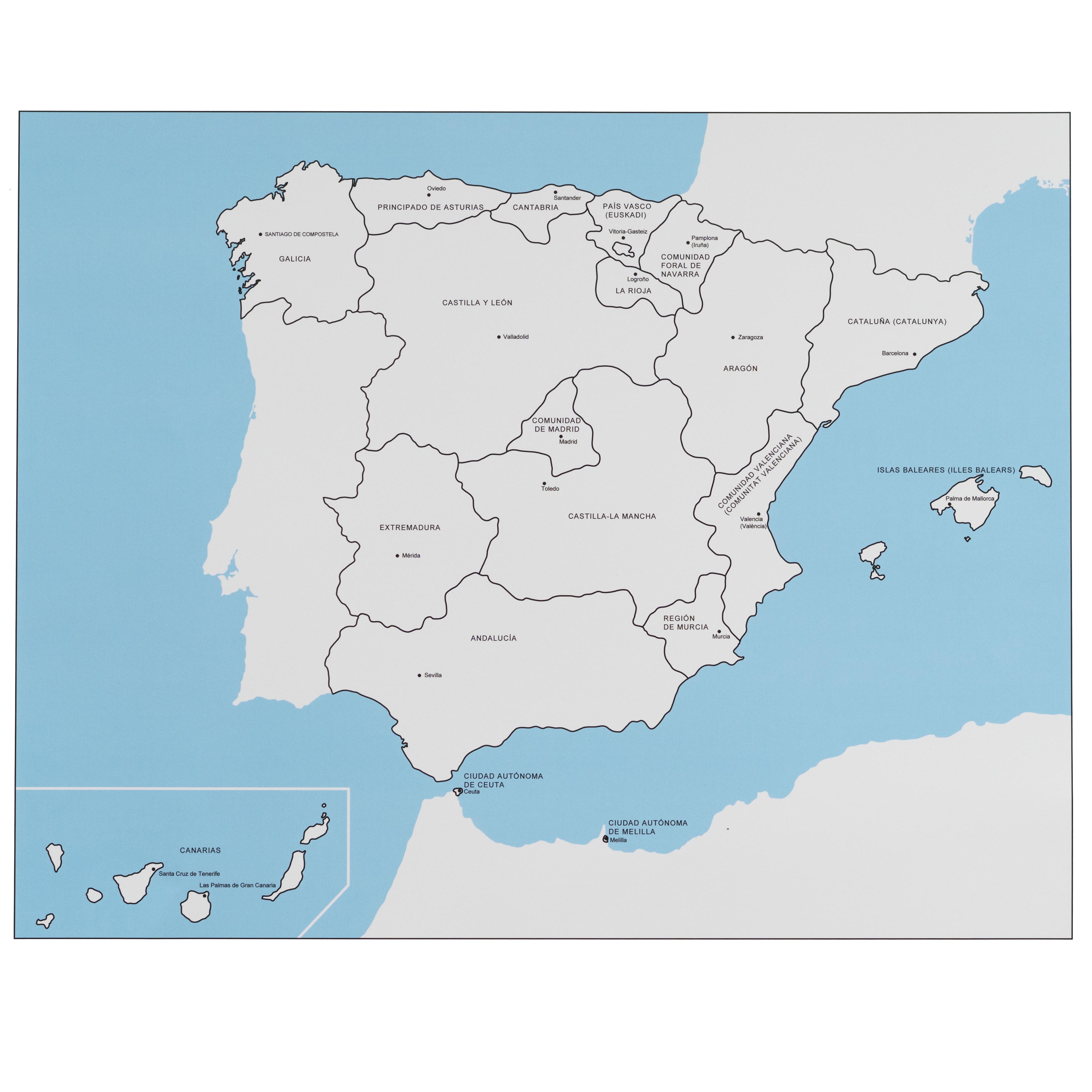 This labeled control map of Spain introduces children to the country's autonomous communities and major cities through clear, color-coded regions. The detailed cartographic representation shows all 17 autonomous communities, their capitals, and the Balearic and Canary Islands, supporting the child's exploration of Spanish geography and political divisions. Designed for use with puzzle maps and cultural studies, this control map serves as both a reference tool and an independent learning material.