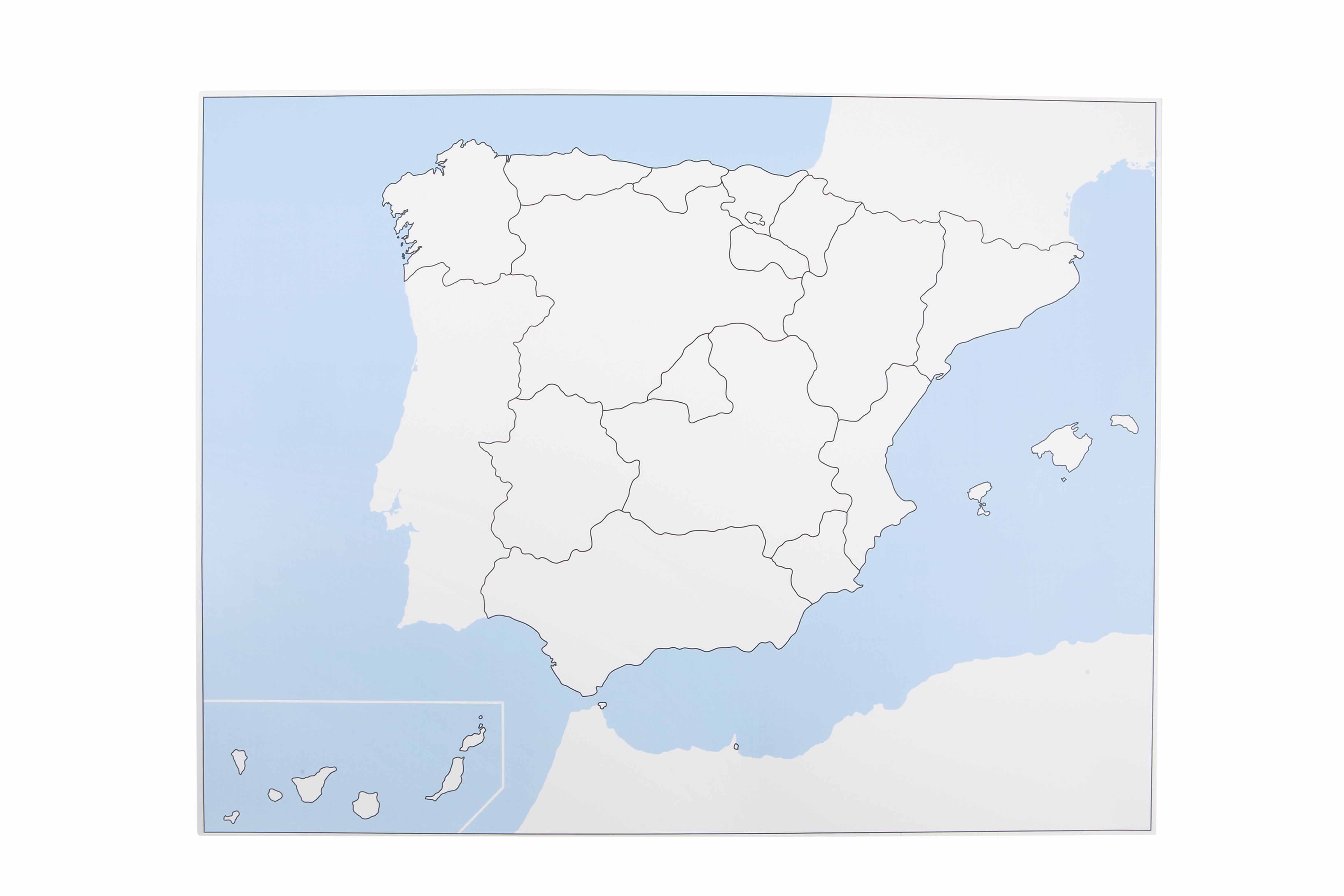 This unlabeled control map of Spain serves as a key reference tool in the Montessori geography curriculum, displaying all autonomous communities with clear boundary lines. The map includes mainland Spain, the Balearic Islands, and features an inset showing the Canary Islands' location, enabling children to verify their work with puzzle maps and develop spatial understanding of Spain's political divisions.