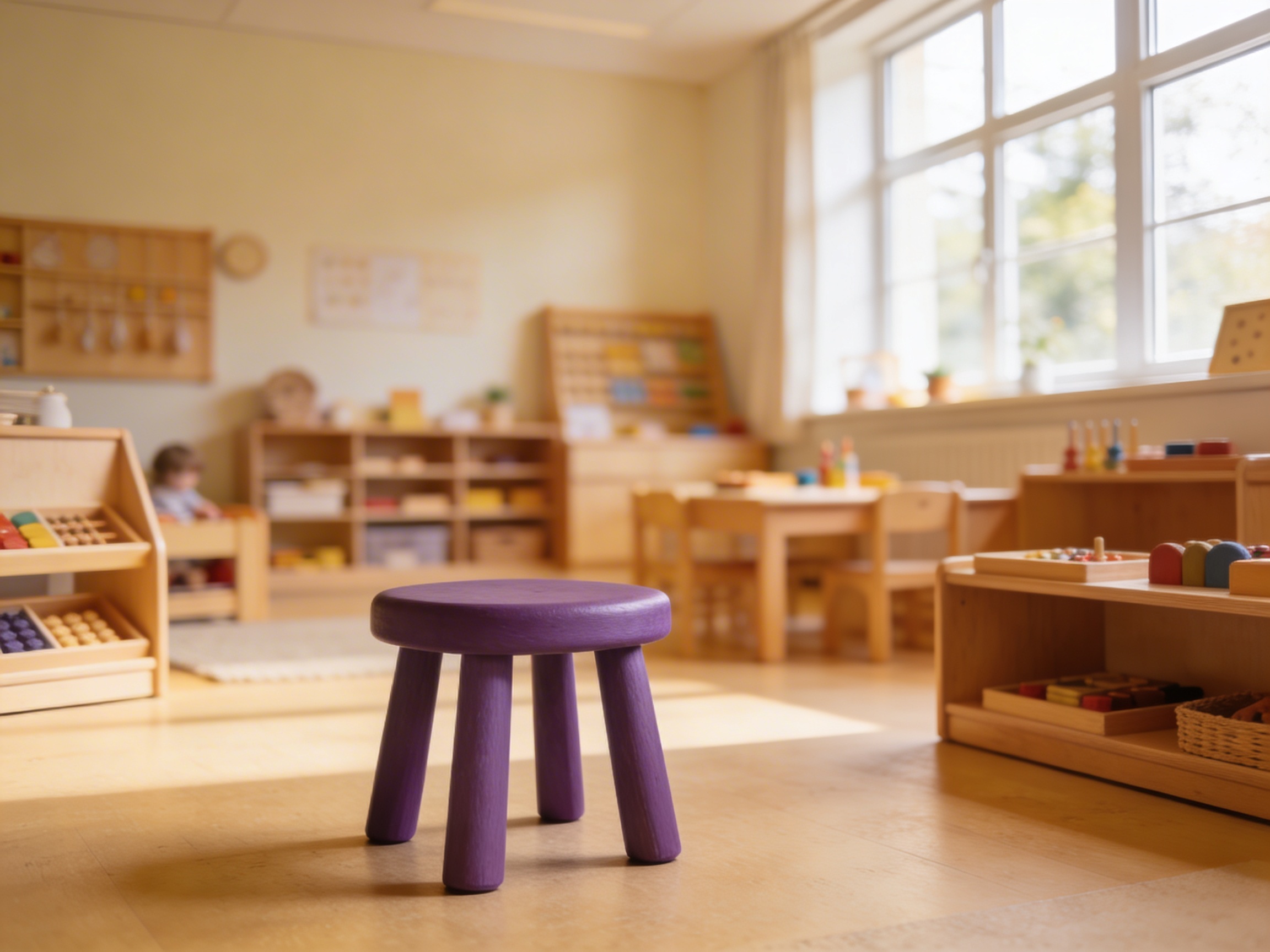 The violet stool represents a fundamental principle in Montessori environments: creating spaces scaled to the child's physical dimensions. At 31 cm high, this stool positions children at optimal working heights for table activities, allowing their feet to rest firmly on the floor while maintaining proper spinal alignment. The oval seat design accommodates the natural sitting posture of 3-6 year olds, while the angled legs provide stability during focused work periods. This violet-colored furniture piece serves as more than seating—it becomes a tool for independence, enabling children to carry their own stool between work areas and choose their workspace autonomously. The protective feet caps on each leg ensure quiet movement across classroom floors, respecting the concentration of others. Through using appropriately-sized furniture like this stool, children develop body awareness and learn to navigate their prepared environment with confidence and purpose.