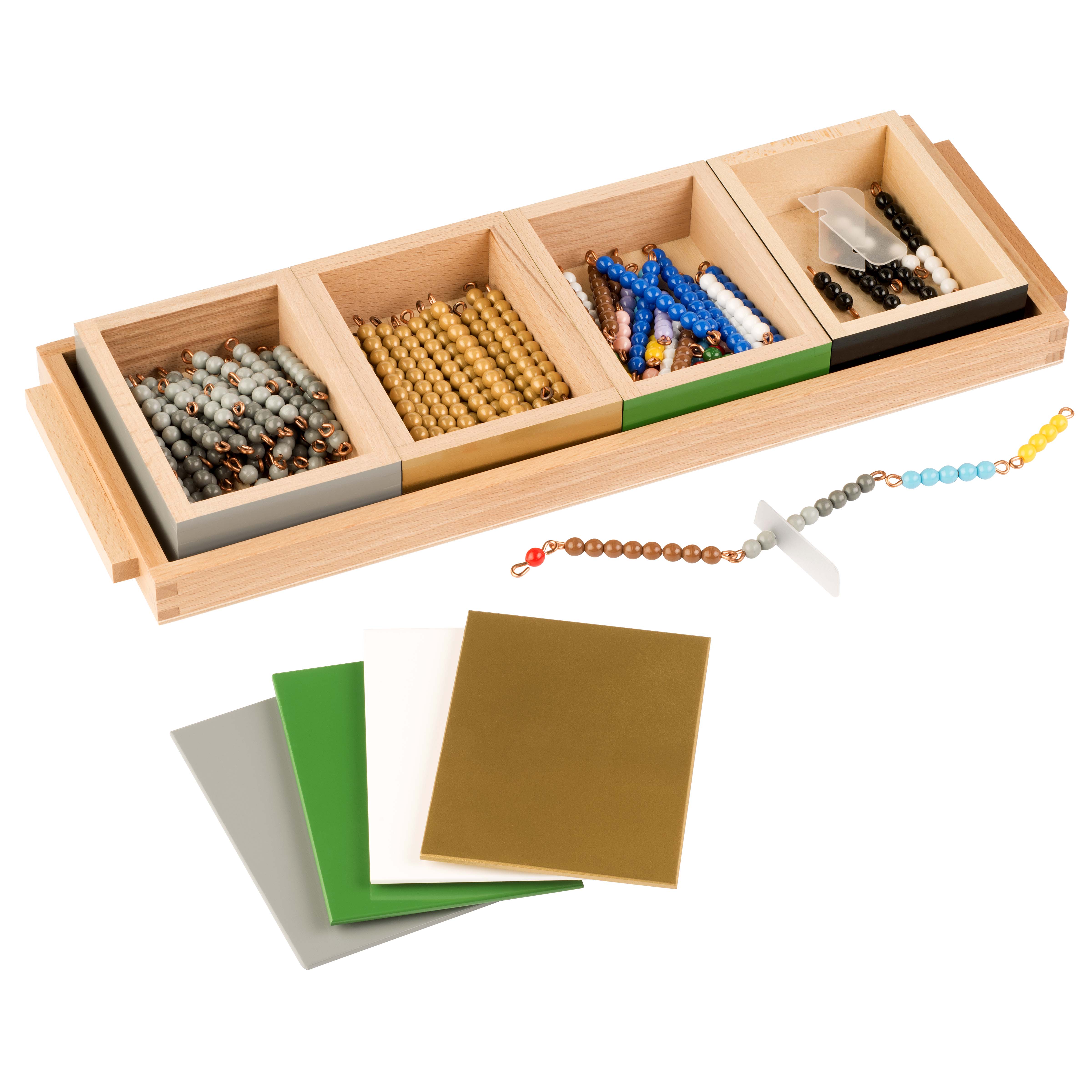 The natural wood tray provides organized storage while teaching children to care for mathematical materials with respect and precision.