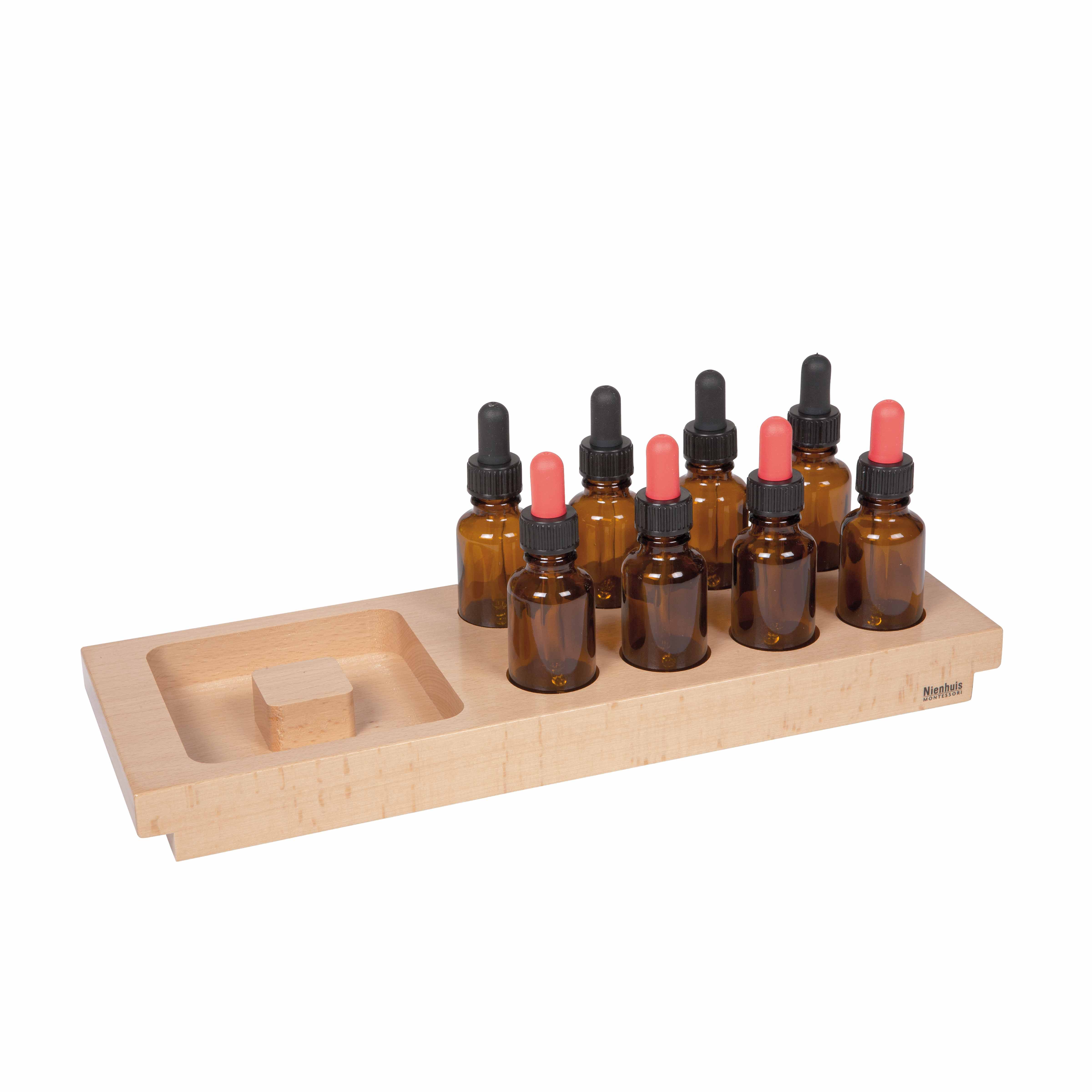 This professional-grade Tasting Exercise set from Nienhuis features nine amber glass dropper bottles housed in a beautifully crafted wooden tray with recessed compartments for organized storage. The alternating black and pink rubber droppers provide visual distinction while children explore gustatory discrimination through carefully prepared taste samples, developing their sensory perception and vocabulary for describing flavors.