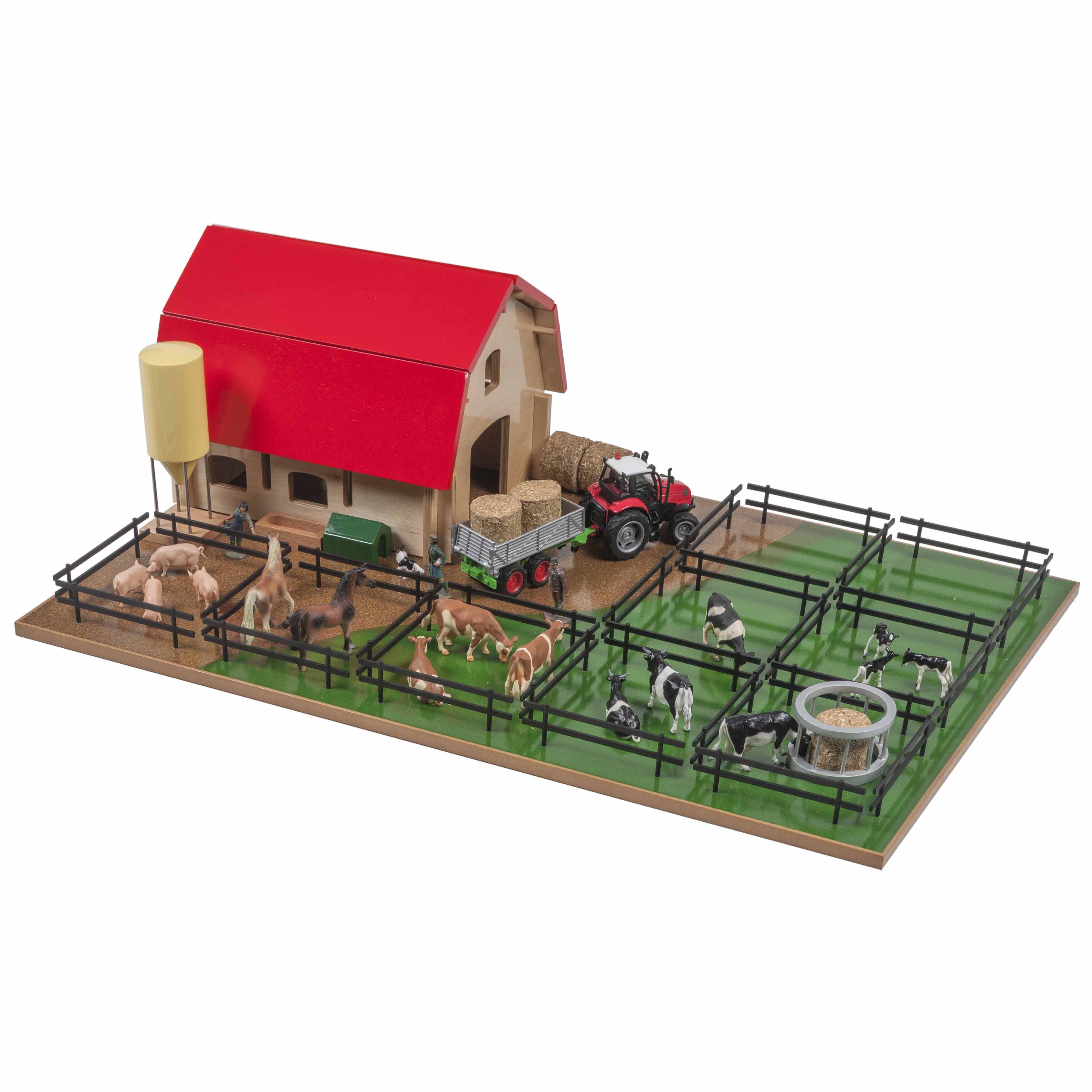 The set includes a detailed wooden barn with functioning doors and a silo, diverse farm animals (typically including cows, pigs, sheep, chickens, and horses), a working tractor with movable parts, fencing pieces, and realistic accessories such as feeding troughs, hay bales, and farm tools. All pieces are crafted from durable, child-safe materials with realistic details.
