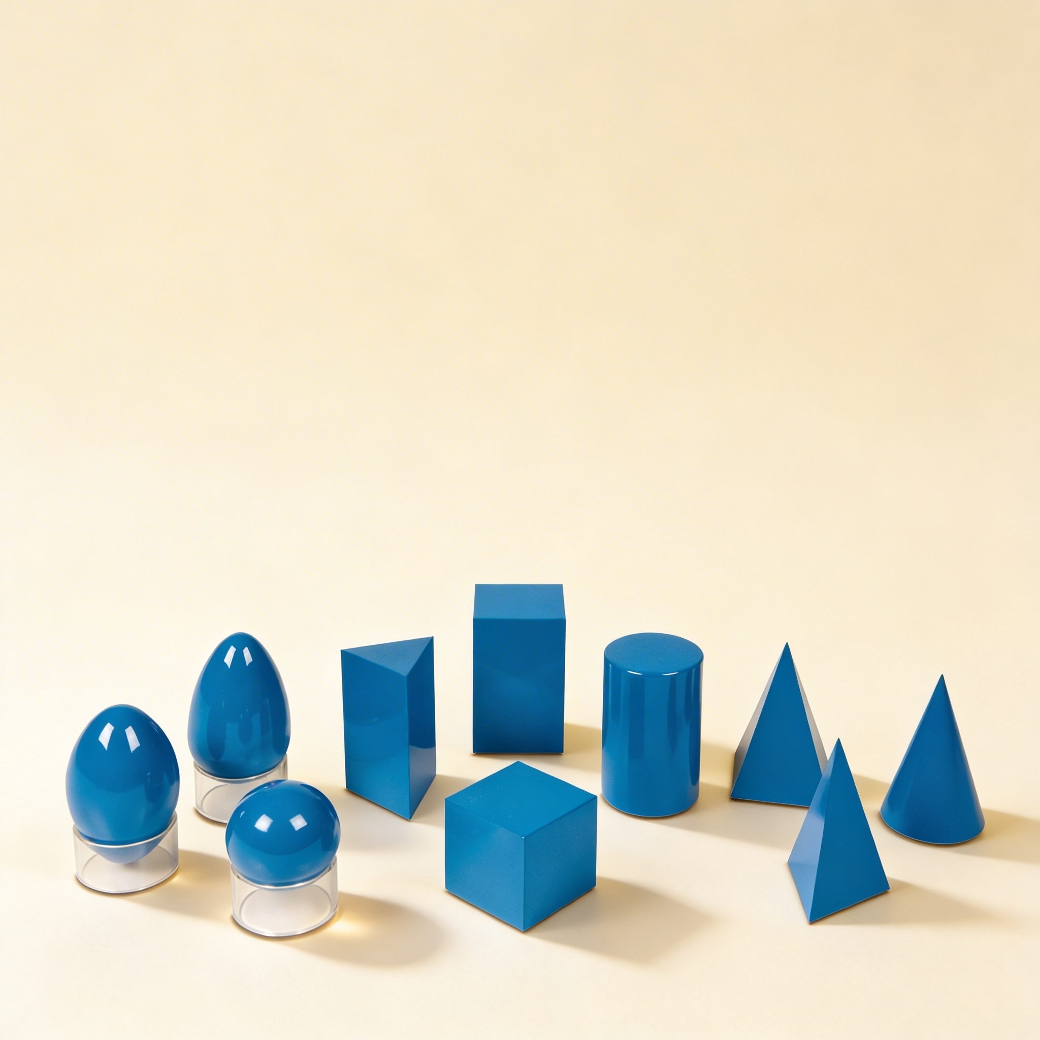 The Geometric Solids introduce children to three-dimensional forms through tactile exploration. This essential Sensorial material features ten distinct geometric shapes in a vibrant blue finish, allowing children to discover relationships between 2D and 3D forms while developing stereognostic sense and mathematical vocabulary.
