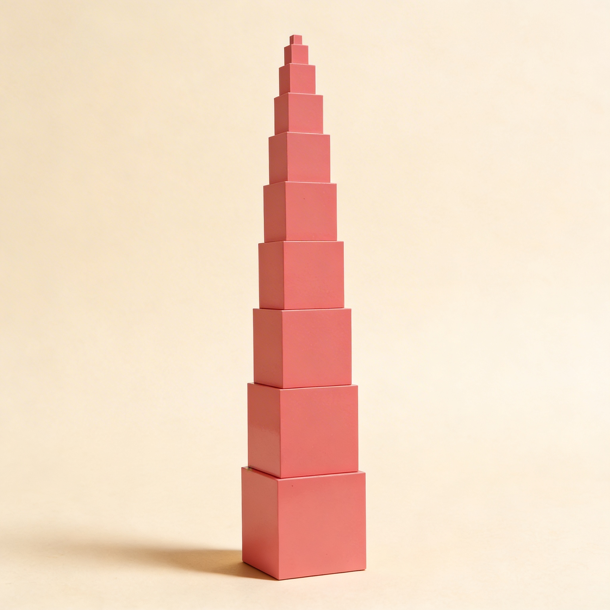 The Pink Tower is a fundamental Montessori sensorial material consisting of ten precisely graduated wooden cubes painted in soft pink. Each cube increases in size from 1cm³ to 10cm³, allowing children to explore dimensional variations through visual and muscular perception while developing concentration and fine motor control.