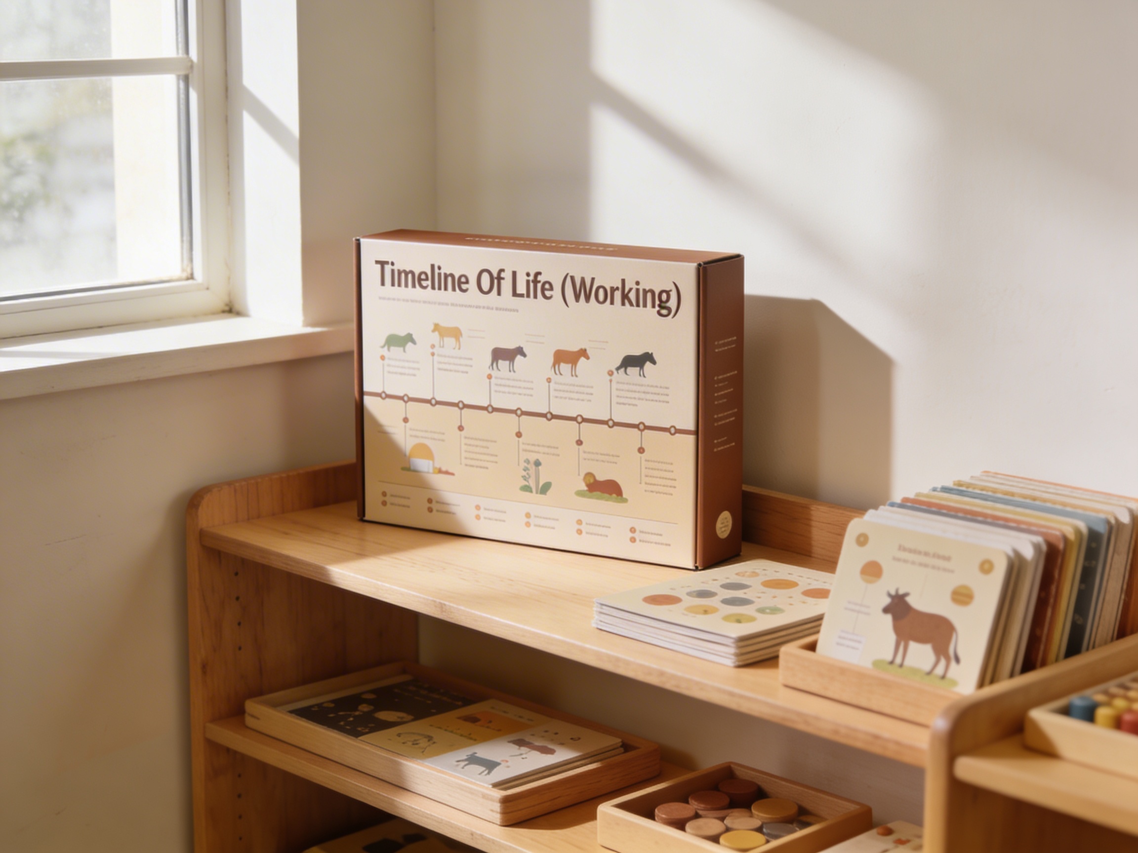 The Timeline of Life materializes cosmic education's central principle by presenting Earth's biological history as one interconnected story. This visual timeline transforms abstract geological eras into concrete, sequential periods that children can physically trace with their fingers. Each illustrated prehistoric creature on the timeline represents millions of years of evolution, making vast time scales comprehensible to the elementary child's reasoning mind. The Timeline of Life answers the child's fundamental questions about origins—where did life come from, how did it change, and what came before humans? By showing evolutionary progression through clear arrows and period labels from Paleozoic through Cenozoic, this timeline satisfies the elementary child's need to understand relationships and connections. The detailed illustrations of prehistoric plants and animals engage imagination while grounding it in scientific fact, characteristic of Montessori's approach to elementary education.
