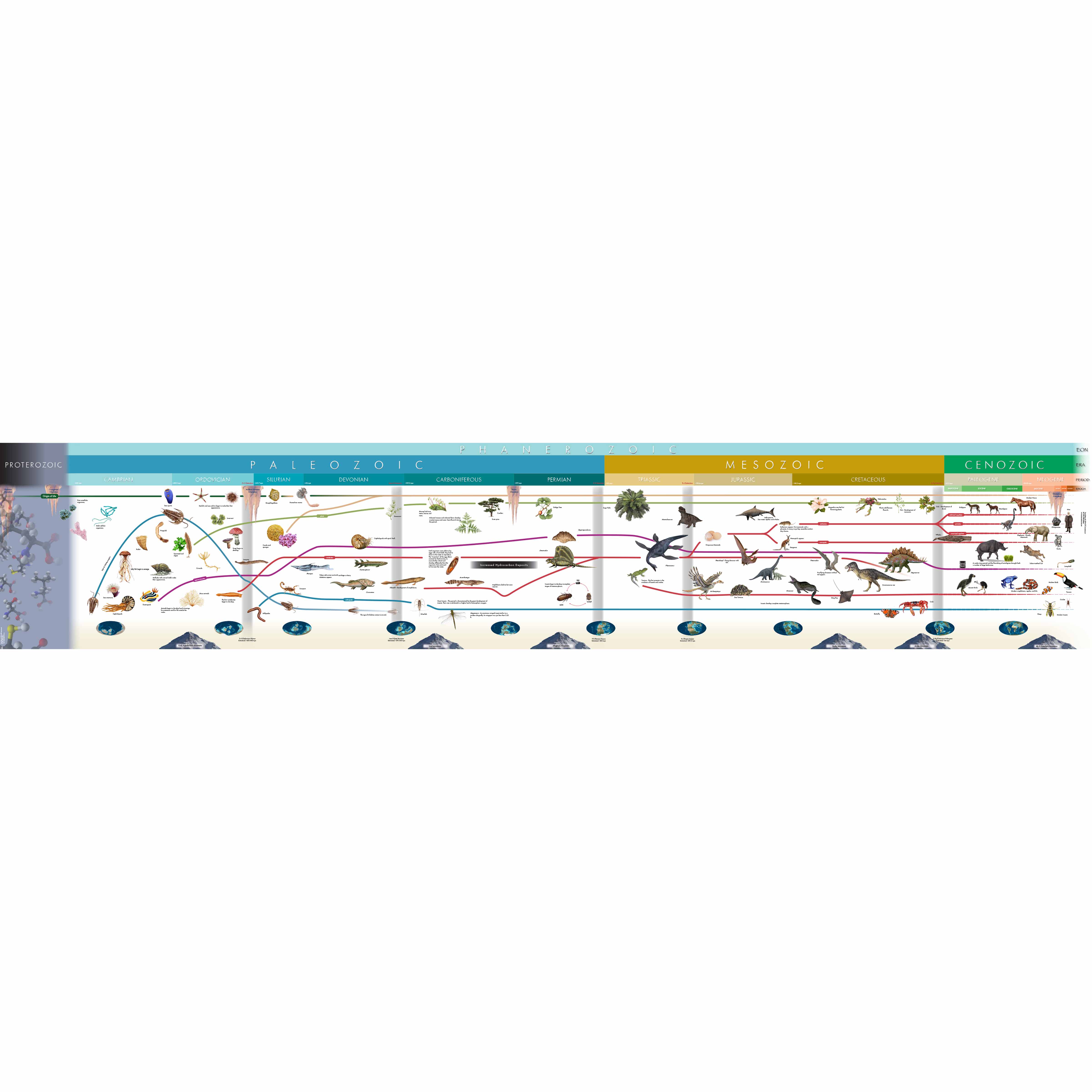 The timeline covers all major geological eras from the Paleozoic (including Cambrian, Ordovician, Silurian, Devonian, Carboniferous, and Permian), through the Mesozoic (Triassic, Jurassic, Cretaceous), to the Cenozoic era. Each period features accurate illustrations of representative life forms, from early marine organisms to dinosaurs to mammals.