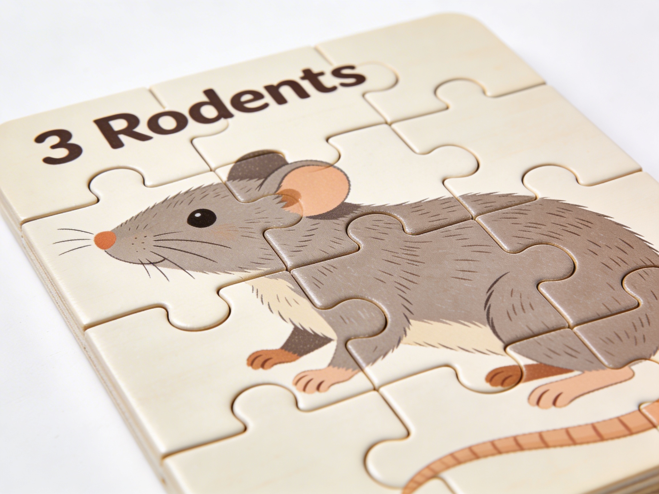 The Toddler Puzzle: 3 Rodents addresses the developmental need for order and classification that emerges between 18-36 months. Each rodent's realistic photographic image provides concrete visual information that toddlers can connect to their real-world experiences, while the three distinct cutout shapes introduce early geometric discrimination. The oversized wooden knobs meet toddlers precisely where their pincer grasp is still developing, allowing independent manipulation without frustration. Unlike abstract shapes, these three rodent images offer meaningful content that engages a toddler's natural interest in living creatures. The wooden construction provides satisfying weight and texture feedback as pieces are lifted and placed. By limiting the puzzle to three pieces, toddlers experience the complete work cycle of removing, examining, and replacing each rodent without overwhelming their concentration span. This specific design bridges the gap between simple shape sorters and more complex puzzles, offering just enough challenge for emerging problem-solving abilities while ensuring repeated success that builds confidence in puzzle work.