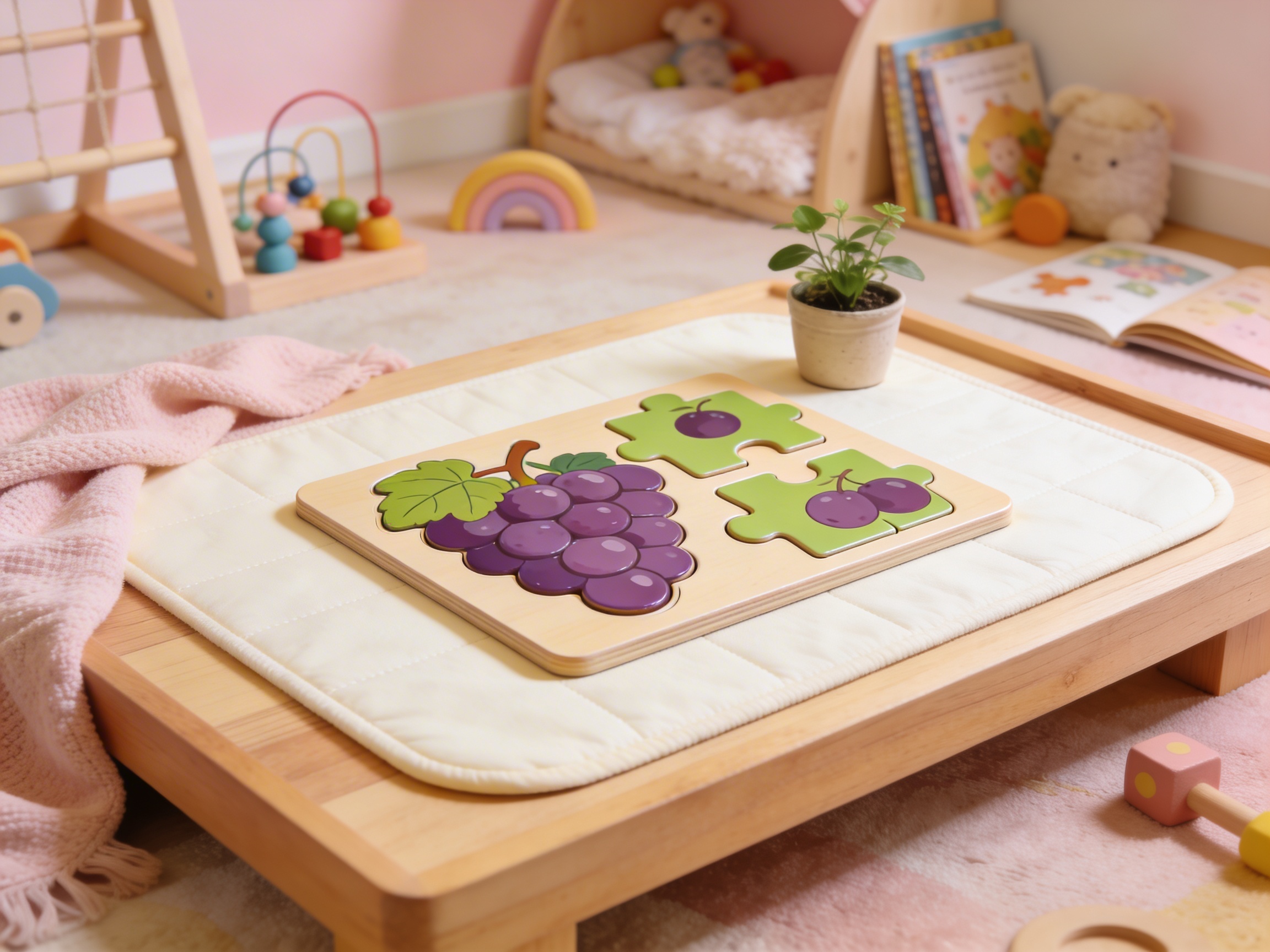 The Toddler Puzzle: Grapes represents the beginning of the child's journey with puzzles in the Montessori environment. Its single grape piece with oversized knob meets the toddler precisely where their hand development stands—between the palmar grasp of infancy and the refined pincer grasp they are beginning to master. The photorealistic grape image connects the child to real objects in their world, establishing the foundation for later abstract thinking. The recessed base of this grape puzzle creates a control of error that allows toddlers to self-correct when the piece doesn't fit properly. This single-piece design isolates the difficulty, presenting just one challenge: removing and replacing the grape piece. Through repeated work with this grape puzzle, toddlers build the hand strength, coordination, and visual perception needed for more complex puzzles. The puzzle's simplicity honors the absorbent mind of the toddler, who gains deep satisfaction from mastering one clear task completely before moving to greater complexity.