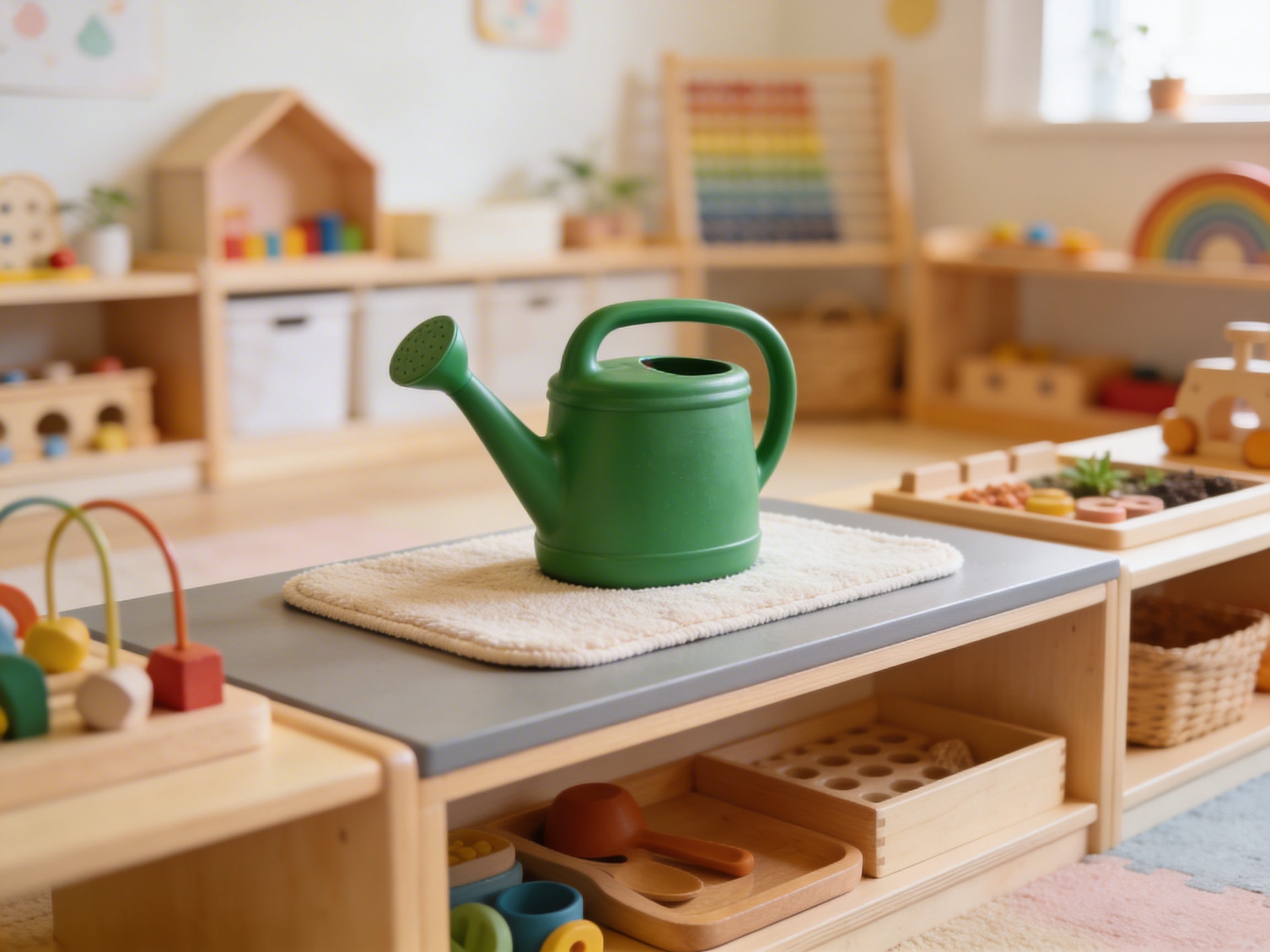 The Toddler Watering Can: Green is a Infant & Toddler (0-3) Montessori material designed for children aged 0-3, crafted by Nienhuis Montessori to AMI standards.
